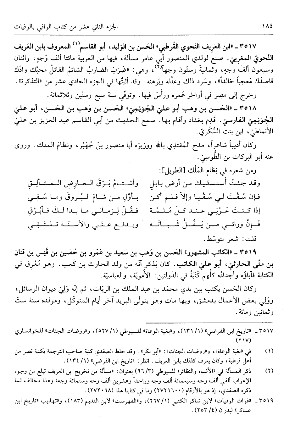 الْحسن بن الْوَلِيد أَبُو الْقَاسِم الْمَعْرُوف بِابْن العريف النَّحْوِيّ المغربي صنع لوَلَدي الْمَنْصُور أبي عَامر مَسْأَلَة فِيهَا من الْعَرَبيَّة مِائَتَا ألف وجهٍ وَاثْنَانِ وَسَبْعُونَ ألف وجهٍ وثمانيةٌ وَسِتُّونَ وَجها وَهِي ضرب الضَّارِب الشاتم الْقَاتِل محبك وادك قاصدك معجباً خَالِدا وسرد ذَلِك وَعلله وبرهنه وَقد أثبتها فِي الْجُزْء الْحَادِي عشر من التَّذْكِرَة