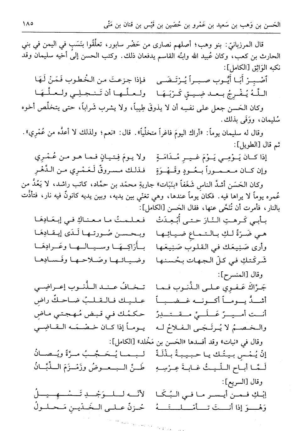 وَكَانَ الْحسن أَشد النَّاس شغفاً بنبات جَارِيَة مُحَمَّد بن حَمَّاد كَاتب رَاشد لَا يعد من عمره يَوْمًا لَا يَرَاهَا فِيهِ فَكَانَ يَوْمًا عِنْدهَا وَهِي تغني بَين يَدَيْهِ وَبَين يَدَيْهِ كانونٌ فِيهِ نارٌ فتأذت بالنَّار فَأمرت أَن تنحى عَنْهَا فَقَالَ الْحسن من الْكَامِل