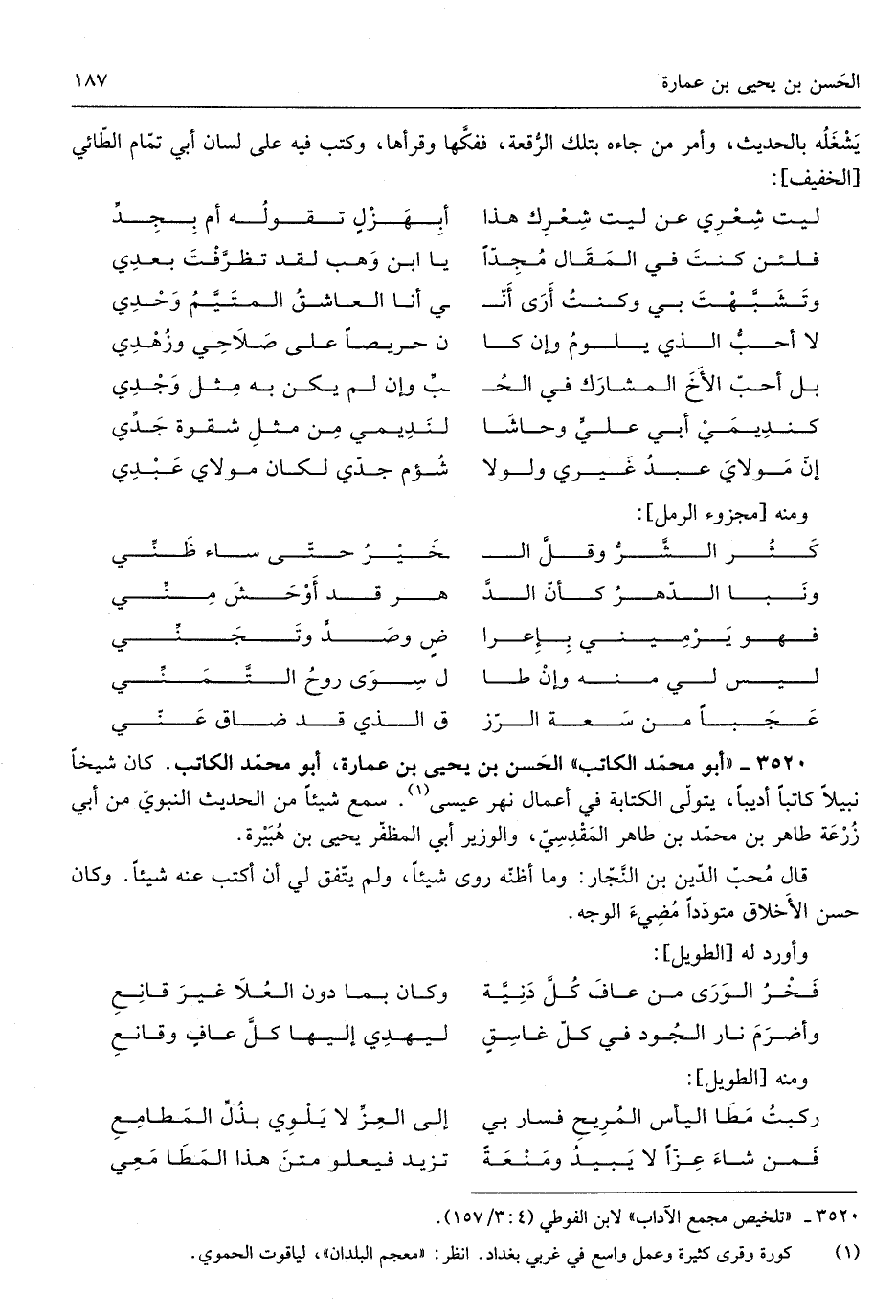 الْحسن بن يحيى بن عمَارَة أَبُو مُحَمَّد الْكَاتِب كَانَ شَيخا نبيلاً كَاتبا أديباً يتَوَلَّى الْكِتَابَة فِي أَعمال نهر عِيسَى