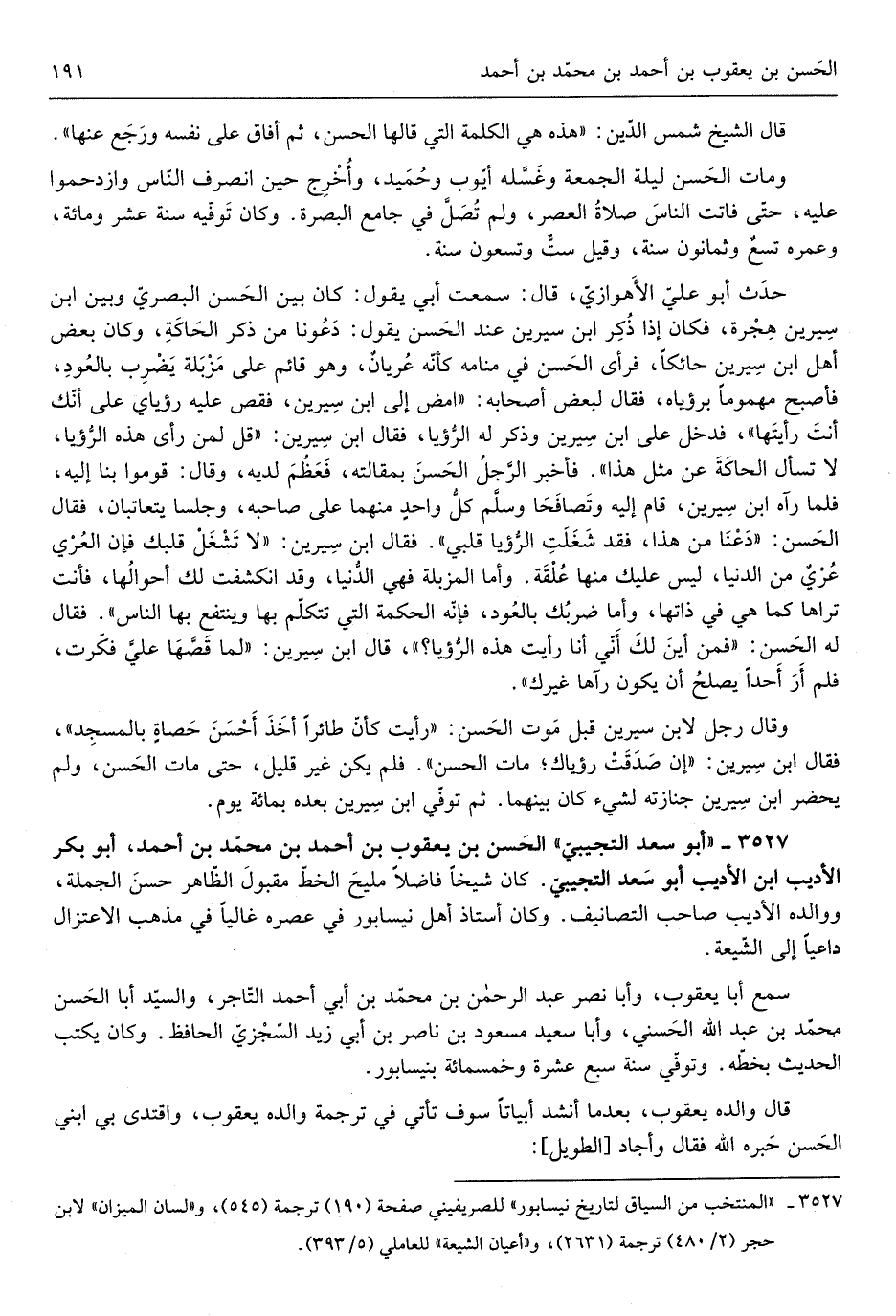 حدث أَبُو عَليّ الْأَهْوَازِي قَالَ سَمِعت أبي يَقُول كَانَ بَين الْحسن الْبَصْرِيّ وَبَين ابْن سِيرِين هِجْرَة فَكَانَ إِذا ذكر ابْن سِيرِين عِنْد الْحسن يَقُول دَعونَا من ذكر الحاكة وَكَانَ بعض أهل)