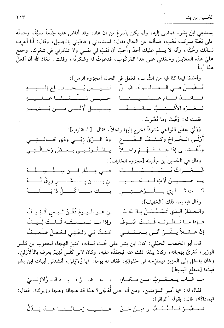 يستدغي ابْن بشر فَمضى إِلَيْهِ وَلم يكن بأسرع من أَن عَاد وَقد أَفَاضَ عَلَيْهِ خلعةً سنيةً وَحمله على بغلة بمركب ذهب فَسَأَلته عَن الْحَال فَقَالَ استدعاني وخاطبني بالجميل وَقَالَ أَنا أعرف لسَانك وخبثه وَأَنه لَا يسلم عَلَيْك أحدٌ وَأحب أَن تهب لي نَفسِي وَلَا تذكرني فِي شعرك وخلع عَليّ هَذِه الملابس وحملني على هَذَا المركوب فدعوت لَهُ وشكرته وَقلت معَاذ الله أَن أفعل هَذَا أبدا
