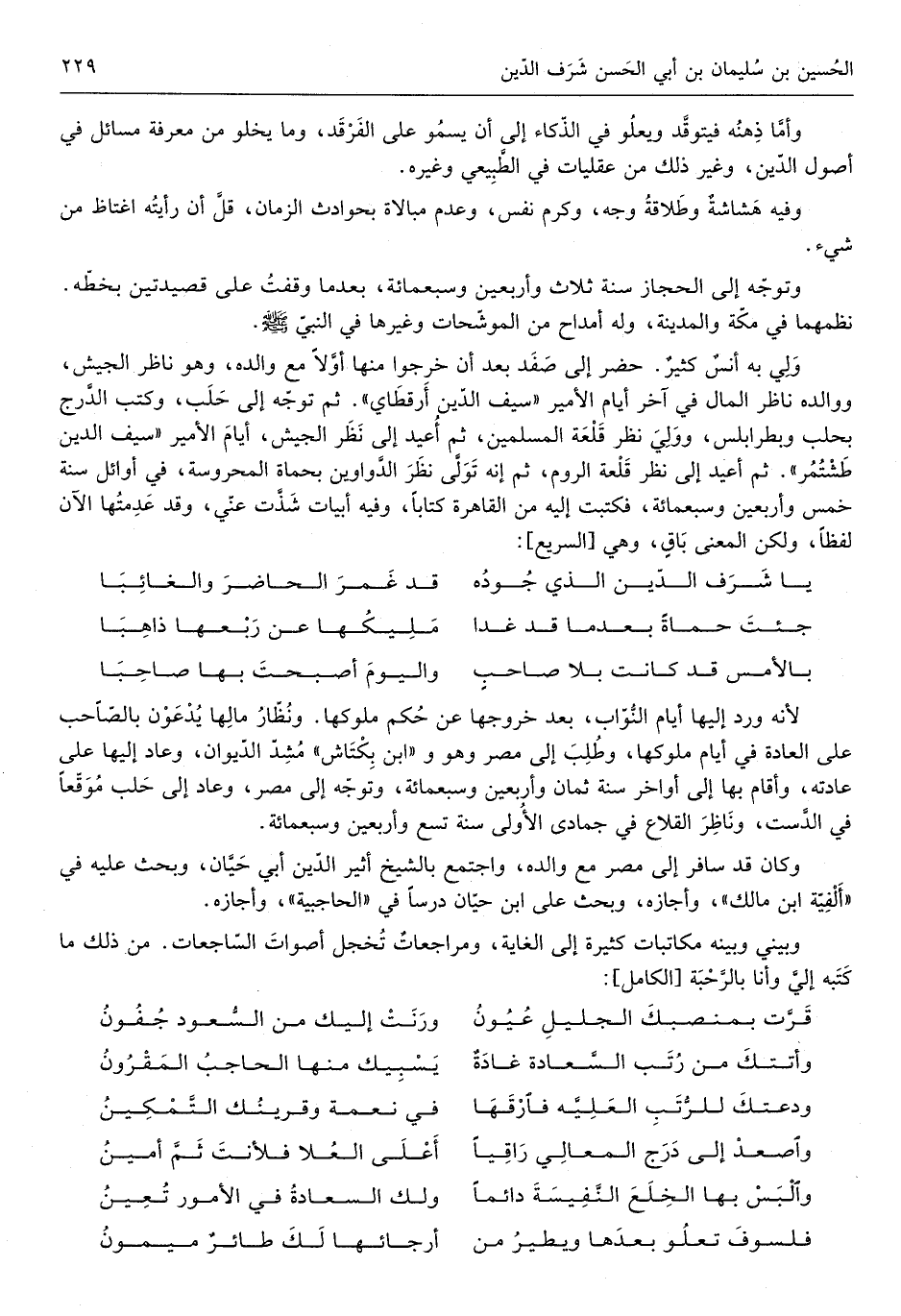 وبيني وَبَينه مكاتبات كَثِيرَة إِلَى الْغَايَة ومراجعاتٌ تخجل أصوات الساجعات من ذَلِك مَا كتبه إِلَيّ وَأَنا بالرحبة من الْكَامِل
