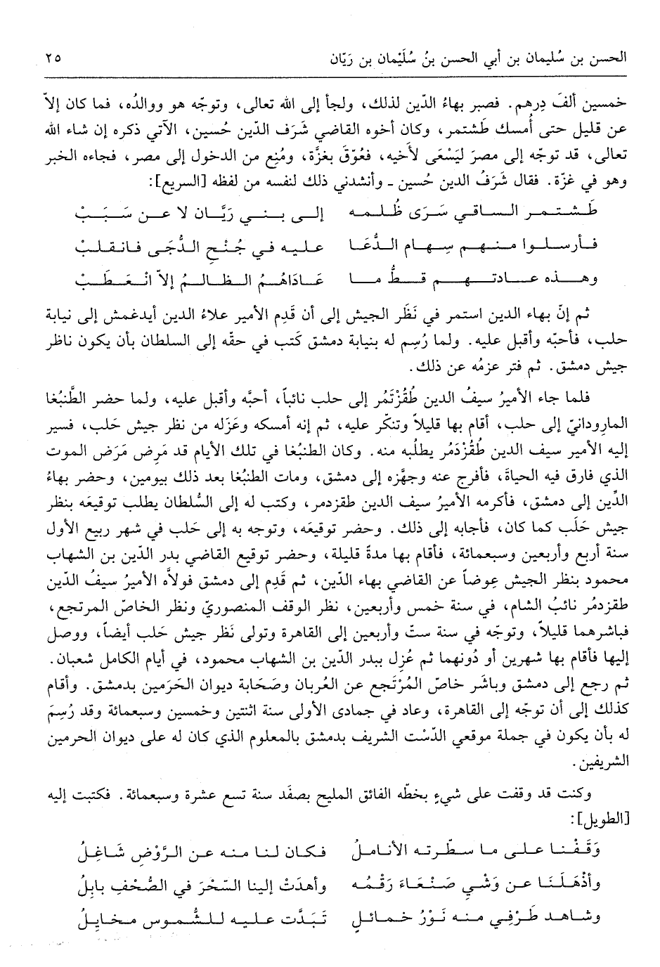 خمسين ألف دِرْهَم فَصَبر بهاء الدّين لذَلِك ولجأ إِلَى الله تَعَالَى وَتوجه هُوَ ووالده فَمَا كَانَ إِلَّا عَن قَلِيل حَتَّى أمسك طشتمر وَكَانَ أَخُوهُ القَاضِي شرف الدّين حُسَيْن الْآتِي ذكره إِن شَاءَ الله تَعَالَى قد توجه إِلَى مصر ليسعى لِأَخِيهِ فعوق بغزة وَمنع من الدُّخُول إِلَى مصر فَجَاءَهُ الْخَبَر وَهُوَ فِي غَزَّة فَقَالَ شرف الدّين حُسَيْن وأنشدني ذَلِك لنَفسِهِ من لَفظه من السَّرِيع