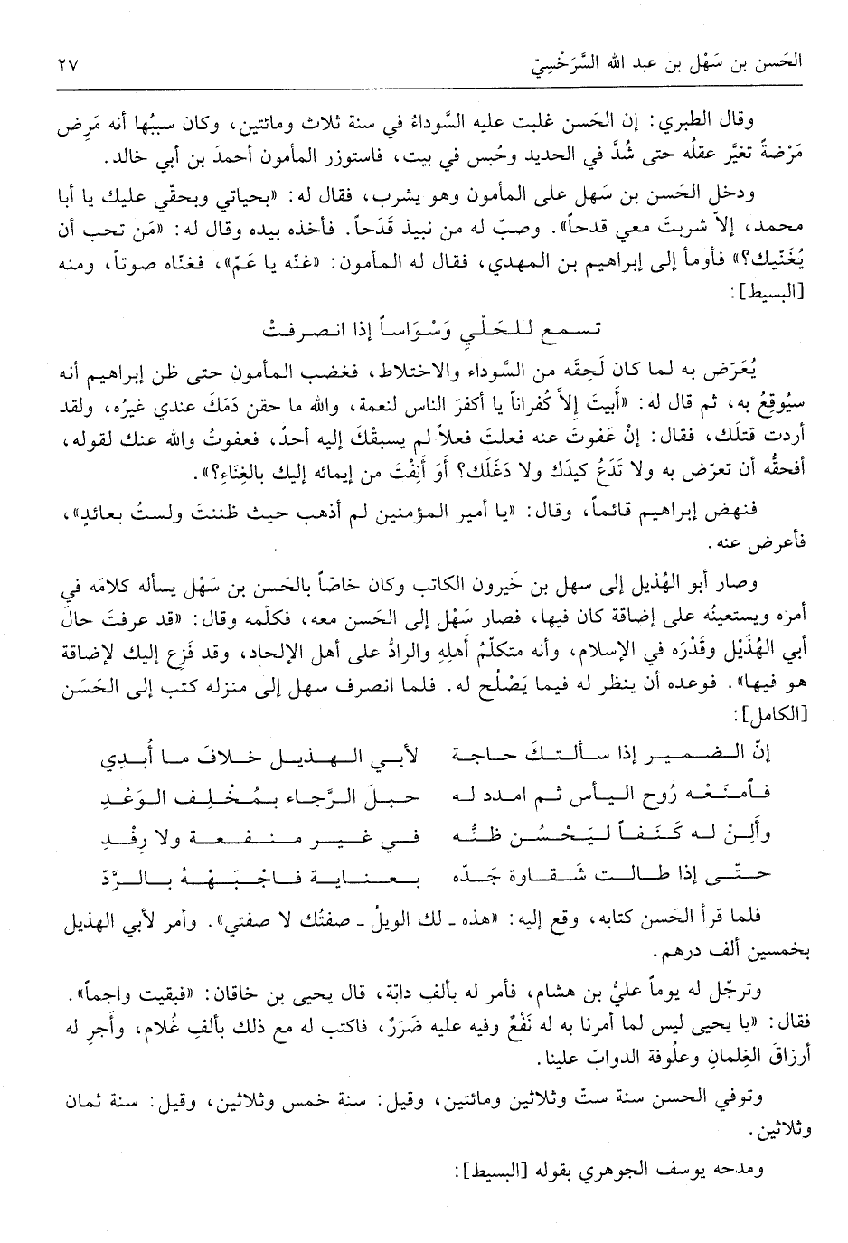 وَدخل الْحسن بن سهل على الْمَأْمُون وَهُوَ يشرب فَقَالَ لَهُ بحياتي وبحقي عَلَيْك يَا أَبَا مُحَمَّد إِلَّا شربت معي قدحاً وصب لَهُ من نَبِيذ قدحاً فَأَخذه بِيَدِهِ وَقَالَ لَهُ من تحب أَن تغنيك فَأَوْمأ إِلَى إِبْرَاهِيم بن الْمهْدي فَقَالَ لَهُ الْمَأْمُون غنه يَا عَم فغناه صَوتا وَمِنْه من الْبَسِيط تسمع للحلي وسواساً إِذا انصرفت)