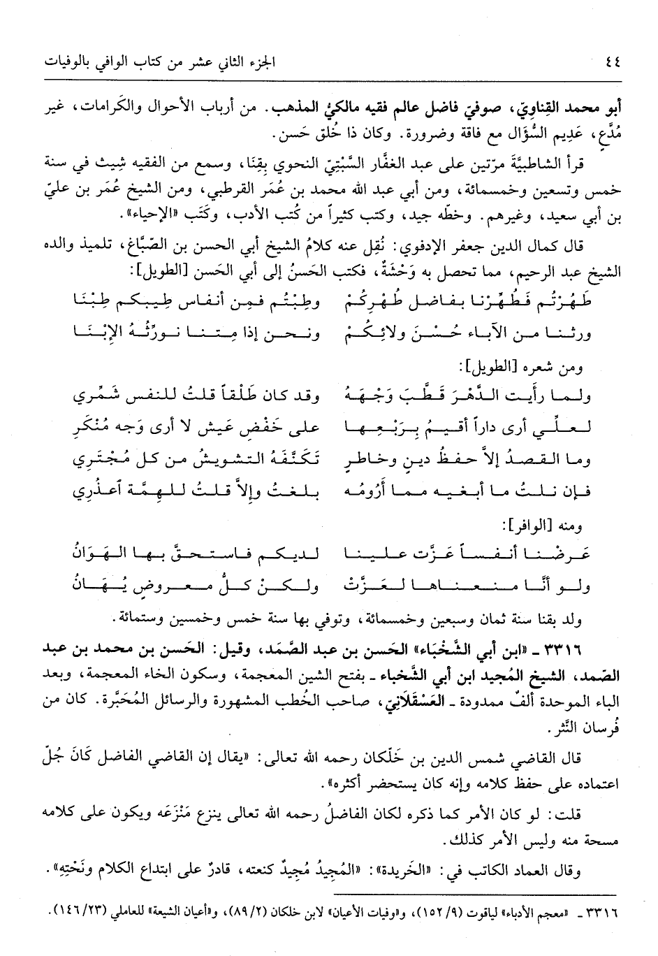 قَالَ كَمَال الدّين جَعْفَر الإدفوي نقل عَنهُ كَلَام الشَّيْخ أبي الْحسن بن الصّباغ تلميذ وَالِده الشَّيْخ عبد الرَّحِيم مِمَّا تحصل بِهِ وحشةٌ فَكتب الْحسن إِلَى أبي الْحسن من الطَّوِيل