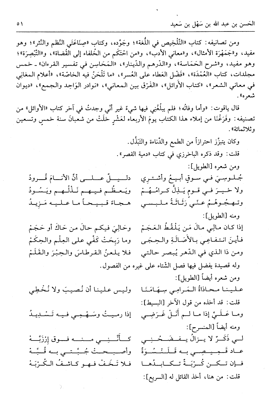 وَمن تصانيفه كتاب التَّلْخِيص فِي اللُّغَة وجوده وَكتاب صناعتي النّظم والنثر وَهُوَ مُفِيد وجمهرة الْأَمْثَال ومعاني الْأَدَب وَمن احتكم من الْخُلَفَاء إِلَى الْقُضَاة والتبصرة وَهُوَ مُفِيد وَشرح الحماسة وَالدِّرْهَم وَالدِّينَار المحاسن فِي تَفْسِير الْقُرْآن خمس مجلدات كتاب الْعُمْدَة فضل الْعَطاء على الْعسر مَا تلحن فِيهِ الْخَاصَّة أَعْلَام المغاني فِي مَعَاني الشّعْر كتاب الْأَوَائِل الْفرق بَين الْمعَانِي نَوَادِر الْوَاحِد وَالْجمع ديوَان شعره