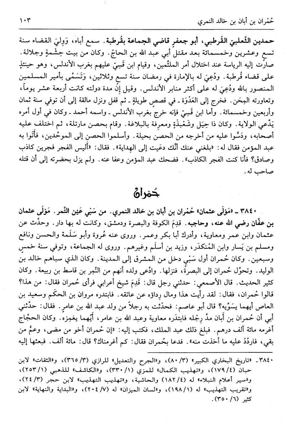 حمْرَان بن أبان بن خَالِد النمري من سبي عين التَّمر مولى عُثْمَان بن عفَّان رَضِي الله عَنهُ وحاجبه قدم الْكُوفَة وَالْبَصْرَة ودمشق وَكَانَ لَهُ بهَا دَار وحدَّث عَن عُثْمَان وَابْن عمر وَمُعَاوِيَة وَأدْركَ أَبَا بكر وَعمر روى عَنهُ عُرْوَة وَأَبُو سَلمَة وَالْحسن وَنَافِع وَمُسلم بن يسَار وَابْن الْمُنْكَدر وَزيد بن اسْلَمْ وَغَيرهم وروى لَهُ الجامعة وَتُوفِّي سنة خمسٍ وَسبعين وَكَانَ حمْرَان أول سبيٍ دخل من الْمشرق إِلَى الْمَدِينَة وَكَانَ الَّذِي سباهم خَالِد بن الْوَلِيد وتحوَّل حمْرَان إِلَى الْبَصْرَة فنزلها وادَّعى وَلَده أَنهم من النَّمر بن قاسط بن ربيعَة وَكَانَ كثير الحَدِيث قَالَ الْأَصْمَعِي حَدثنِي رجل قَالَ قدم شيخ أَعْرَابِي فَرَأى حمْرَان فَقَالَ من هَذَا قَالُوا حمْرَان فَقَالَ لقد رَأَيْت هَذَا وَمَال رِدَاؤُهُ عَن عَاتِقه فَابْتَدَرَهُ مَرْوَان بن الحكم وَسَعِيد بن الْعَاصِ أَيهمَا يسوِّيه قَالَ أَبُو عَاصِم فحدثّت بِهِ رجلا من ولد عبد الله بن عامرٍ فَقَالَ حدَّثني أبي أَن حمْرَان بن أبان مدَّ رجله فَابْتَدَرَهُ مُعَاوِيَة وَعبد الله بن عَامر أَيهمَا يغمزه وَكَانَ الحجَّاج أغرمه مائَة الف دِرْهَم فَبلغ ذَلِك عبد الْملك فَكتب إِلَيْهِ إِن حمْرَان أَخُو من مضى وعمُّ من بَقِي فاردد عَلَيْهِ مَا أخذت مِنْهُ فَدَعَا بحمران فَقَالَ كم أغرمناك قَالَ مائَة ألف