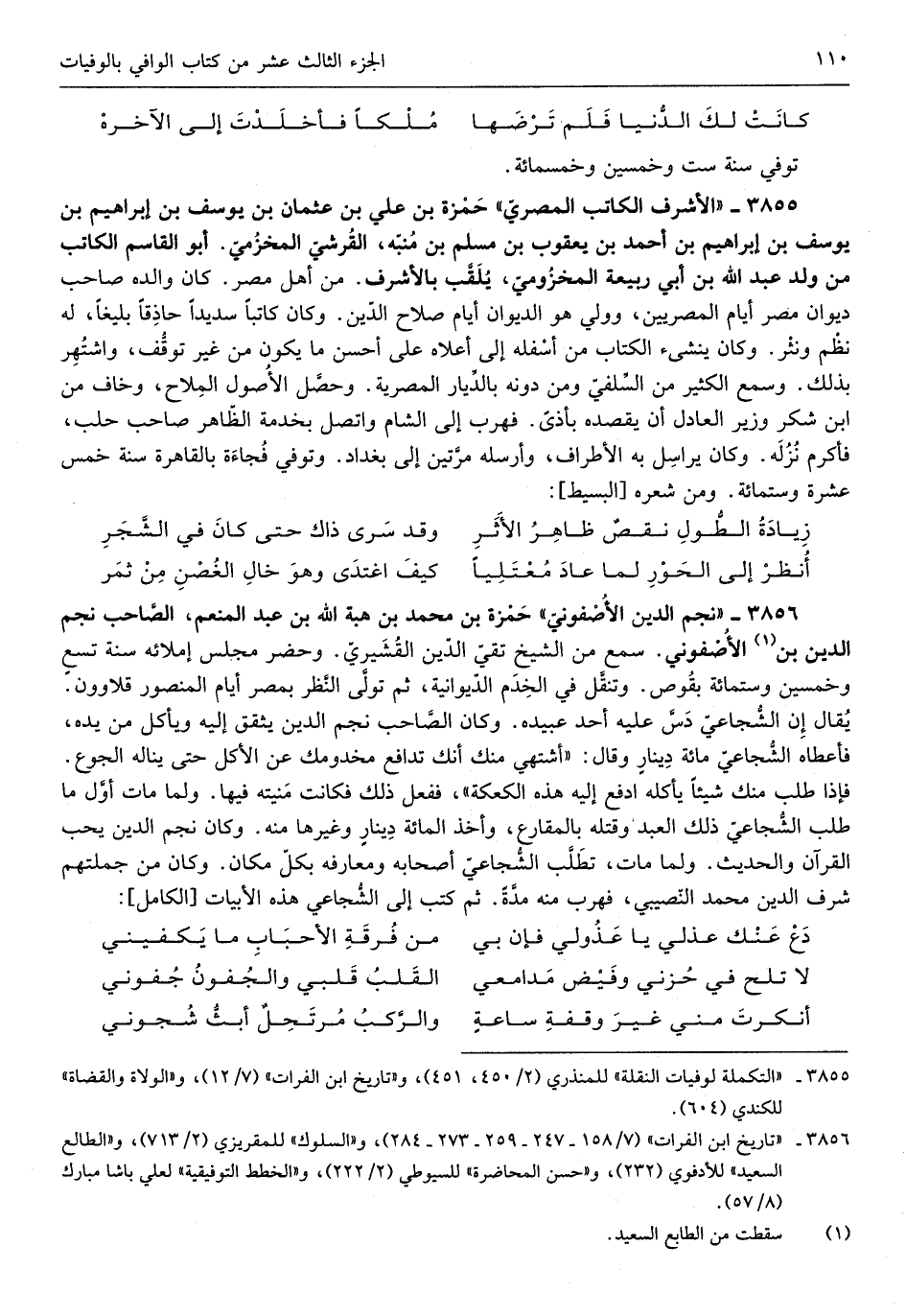 حَمْزَة بن مُحَمَّد بن هبة الله بن عبد الْمُنعم الصَّاحب نجم الدّين بن الأصفوني سمع من الشَّيْخ تقيّ الدّين القشيريّ وَحضر مجْلِس إمْلَائِهِ سنة تسعٍ وَخمسين وست مائَة بقوص وتنقَّل فِي الخدم الدّيوانية ثمَّ تولَّى النَّظر بِمصْر أَيَّام الْمَنْصُور قلاوون يُقَال أَن الشُّجاعيّ دسَّ عَلَيْهِ أحد عبيده وَكَانَ الصَّاحب نجم الدّين يثقق إِلَيْهِ وَيَأْكُل من يَده فَأعْطَاهُ الشُّجاعيّ مائَة دينارٍ وَقَالَ أشتهي مِنْك أَنَّك تدافع مخدومك عَن الْأكل حَتَّى يَنَالهُ الْجُوع فَإِذا طلب مِنْك شَيْئا يَأْكُلهُ ادْفَعْ إِلَيْهِ هَذِه الكعكة فَفعل ذَلِك فَكَانَت منيته فِيهَا وَلما مَاتَ أوَّل مَا طلب الشُّجاعيّ ذَلِك اعبد وَقَتله بالمقارع وَأخذ الْمِائَة دِينَار وَغَيرهَا مِنْهُ وَكَانَ نجم الدّين يحب الْقُرْآن والْحَدِيث لما مَاتَ تطلَّب الشُّجاعيّ أَصْحَابه ومعارفه بكلّ مَكَان وَكَانَ من جُمْلَتهمْ شرف الدّين مُحَمَّد النّصيبي فهرب مِنْهُ مدَّةً ثمَّ كتب إِلَى الشُّجاعي هَذِه الأبيات من الْكَامِل