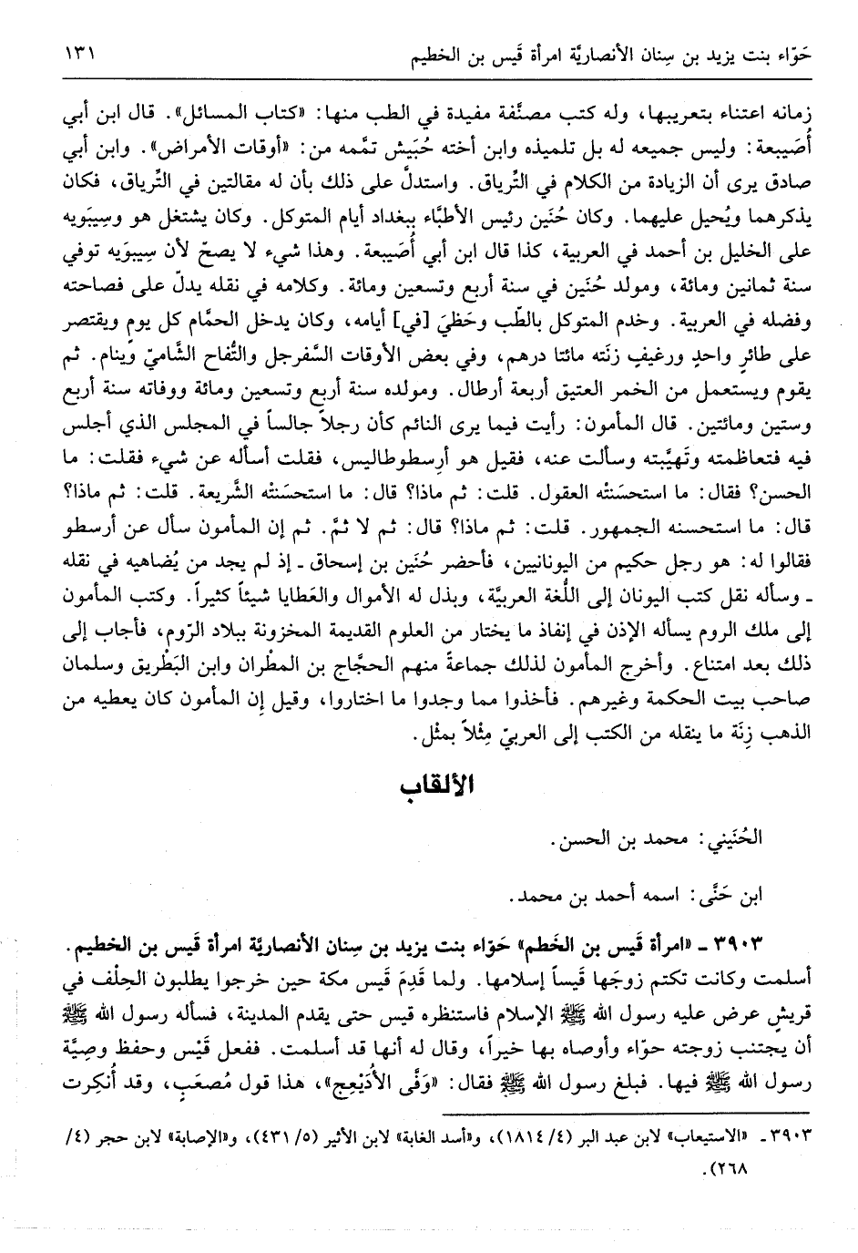 الْكَلَام فِي التِّرياق واستدلَّ على ذَلِك بِأَن لَهُ مقالتين فِي التِّرياق فَكَانَ يذكهرهما ويحيل عَلَيْهِمَا وَكَانَ حنين رَئِيس الأطبَّاء بِبَغْدَاد أَيَّام المتَوَكل وَكَانَ يشْتَغل هُوَ وسيبويه على الْخَلِيل بن أَحْمد فِي الْعَرَبيَّة كَذَا قَالَ ابْن أبي أصبيعة وَهَذَا شيءلا يَصح لِأَن سِيبَوَيْهٍ توفّي سنة ثمانٍ وَمِائَة ومولد حنين فِي سنة أَربع وَتِسْعين وَمِائَة وَكَلَامه فِي نَقله يدلّ على فَصَاحَته وفضله فِي الْعَرَبيَّة وخدم المتَوَكل بالطِّب وحظي أَيَّامه وَكَانَ يدْخل الحمَّام كل يومٍ ويقتصر على طائرٍ واحدٍ ورغيفٍ زنته مِائَتَا دِرْهَم وَفِي بعض الْأَوْقَات السَّفرجل والتُّفاح الشَّاميّ وينام ثمَّ يقوم وَيسْتَعْمل من الْخمر الْعَتِيق أَرْبَعَة أَرْطَال ومولده سنة أَربع وَتِسْعين وَمِائَة ووفاته سنة أَربع وَسِتِّينَ وَمِائَتَيْنِ قَالَ الْمَأْمُون رَأَيْت فِيمَا يرى النَّائِم كَأَن رجلا على كرْسِي جَالِسا فِي الْمجْلس الَّذِي أَجْلِس فِيهِ فتعاظمته وتهيَّبته وَسَأَلت عَنهُ فَقيل هُوَ أرسطوطاليس فَقلت أسأله عَن شَيْء فَقلت مَا الْحسن فَقَالَ مَا استحسنته الْعُقُول قلت ثمَّ مَاذَا قَالَ مَا استحسنته الشَّريعة قلت ثمَّ مَاذَا قَالَ مَا استحسنه الْجُمْهُور قلت ثمَّ مَاذَا قَالَ ثمَّ لَا ثمَّ ثمَّ إِن الْمَأْمُون سَأَلَ عَن أرسطو فَقَالُوا لَهُ هُوَ رجل حَكِيم من اليونانيين فأحضر حنين بن إِسْحَق إِذا لم يجد من يضاهيه فِي نَقله وَسَأَلَهُ نقل كتب اليونان إِلَى اللَّعة العربيَّة وبذل لَهُ من الْأَمْوَال والعطايا شَيْئا كثيرا وَكتب الْمَأْمُون إِلَى ملك الرّوم يسْأَله الْإِذْن فِي إنقاذ مَا يخْتَار من الْعُلُوم الْقَدِيمَة المخزونة ببلاء الرّوم فَأجَاب إِلَى ذَلِك بعد امْتنَاع وَأخرج الْمَأْمُون لذَلِك جمَاعَة مِنْهُم الحجَّاج بن المطران وَابْن البطريق وسلمان صَاحب بَيت الْحِكْمَة وَغَيرهم فَأخذُوا مِمَّا وجدوا مَا اخْتَارُوا وَقيل أَن الْمَأْمُون كَانَ يُعْطِيهِ من الذَّهَب زنة مَا يَنْقُلهُ من الْكتب إِلَى العربيّ مثلا بِمثل