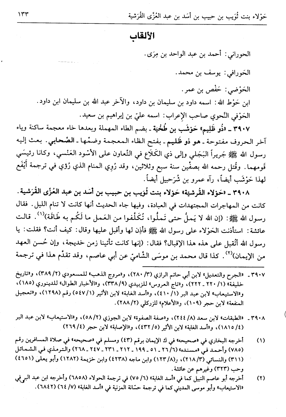 حولاء بنت ثويب بن حبيب بن أَسد بن عبد العزَّى القرشية كَانَت من الْمُهَاجِرَات المجتهدات فِي الْعِبَادَة وفيهَا جَاءَ الحَدِيث أَنَّهَا كَانَت لَا تنام اللَّيْل فَقَالَ رَسُول الله صلى الله عَلَيْهِ وَسلم إِنَّا الله لَا يملُّ حَتَّى تملُّوا تكلَّفوا من الْعَمَل مَا لكم بِهِ طَاقَة قَالَت عَائِشَة اسْتَأْذَنت الحولاء على رَسُول الله صلى الله عَلَيْهِ وَسلم فَأذن لَهَا وَأَقْبل عَلَيْهَا وَقَالَ كَيفَ أَنْت فَقلت يَا رَسُول الله أتقبل على هَذِه هَذَا الإقبال فَقَالَ إِنَّهَا كَانَت تَأْتِينَا زمن خَدِيجَة وَإِن حسن الْعَهْد من الْإِيمَان كَذَا قَالَ مُحَمَّد بن مُوسَى الشَّاميّ عَن أبي عَاصِم وَقد تقدَّم هَذَا فِي تَرْجَمَة