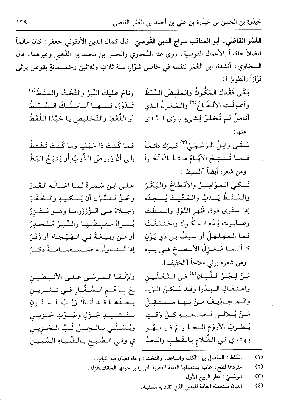 الْغمر القَاضِي أَبُو المناقب سراج الدّين القوصيّ قَالَ كَمَال الدّين الأدفوي جَعْفَر كَانَ عَالما فَاضلا حَاكما بِالْأَعْمَالِ القوصيّة روى عَنهُ السّخاوي وَالْحسن بن مُحَمَّد بن الذّهبي وَغَيرهمَا قَالَ السخاوي أنسدنا ابْن الْغمر لنَفسِهِ فِي خَامِس شوّالٍ سنة ثلاثٍ وَثَلَاثِينَ وَخمْس مائةٍ بقوص يرثي قزّازاً من الطَّوِيل