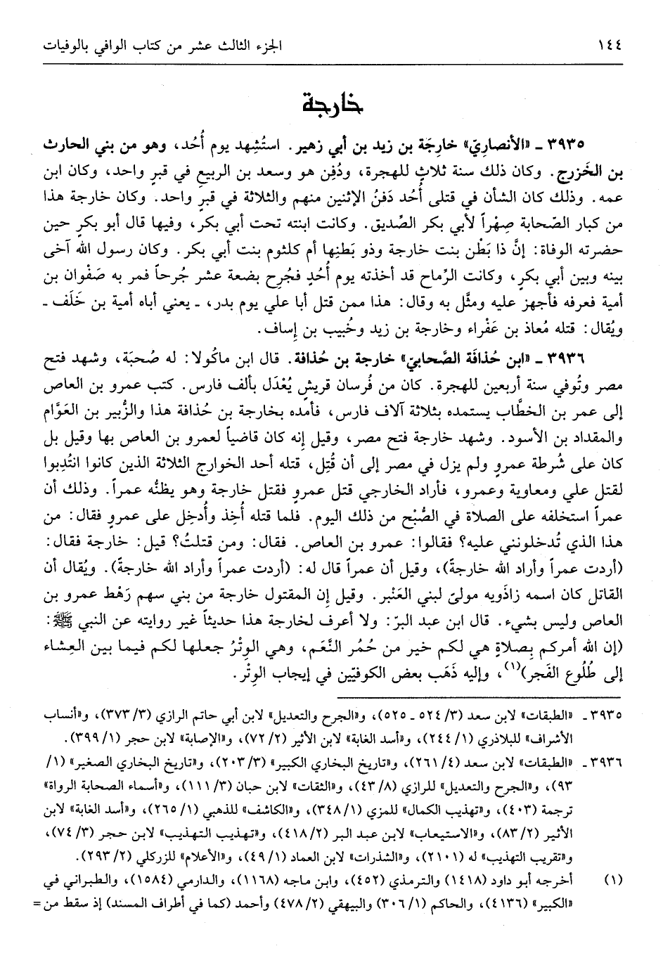 خَارِجَة بن زيد بن أبي زُهَيْر اسْتشْهد يَوْم أحد وَهُوَ من بني الْحَارِث بن الْخَزْرَج وَكَانَ ذَلِك سنة ثلاثٍ لِلْهِجْرَةِ وَدفن هُوَ وَسعد بن الرّبيع فِي قبرٍ وَاحِد وَكَانَ ابْن عَمه وَذَلِكَ كَانَ الشَّأْن فِي قَتْلَى أحد دفن الْإِثْنَيْنِ مِنْهُم وَالثَّلَاثَة فِي قبرٍ وَاحِد وَكَانَ خَارِجَة هَذَا من كبار الصّحابة صهراً لأبي بكر الصِّديق وَكَانَت ابْنَته تَحت أبي بكر وفيهَا قَالَ أَبُو بكرٍ حِين حَضرته الْوَفَاة إنَّ ذَا بطن بنت خَارِجَة وَذُو بَطنهَا أم كلثومٍ بنت أبي بكر وَكَانَ رَسُول الله آخى بَينه وَبَين أبي بكرٍ وَكَانَت الرِّماح قد أَخَذته يَوْم أحدٍ فجرح بضعَة عشر جرحا فَمر بِهِ صَفْوَان بن أُميَّة فَعرفهُ فأجهز عَلَيْهِ ومثَّل بِهِ وَقَالَ هَذَا مِمَّن قتل أَبَا عَليّ يَوْم بدر يَعْنِي أَبَاهُ أَبَا أُميَّة بن خلف وَيُقَال قَتله معَاذ بن عفراء وخارجة بن زيد وخبيب بن إساف