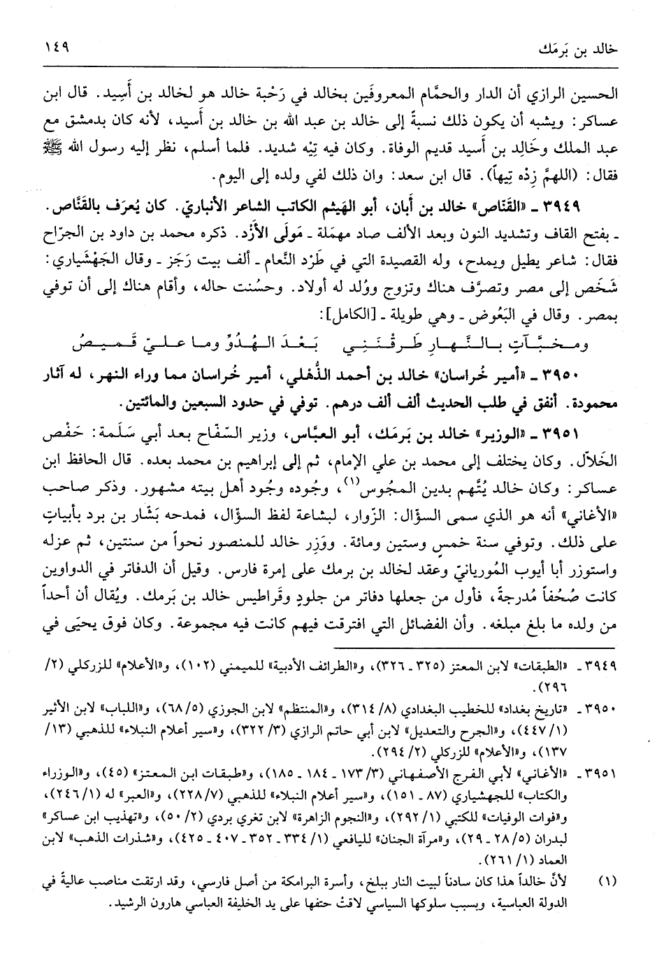 خَالِد بن برمك أَبُو العبَّاس وزيرالسّفّاح بعد أبي سَلمَة حَفْص الخلاّل وَكَانَ يخْتَلف إِلَى مُحَمَّد بن عَليّ الإِمَام ثمَّ إِلَى إِبْرَاهِيم بن مُحَمَّد بعده قَالَ الْحَافِظ ابْن عَسَاكِر وَكَانَ خَالِد يتَّهم بدين الْمَجُوس وجوده وجود أهل بَيته مَشْهُور وَذكر صَاحب الأغاني أَنه هُوَ الَّذِي سمى السُّؤَال الزوّار لبشاعة لفظ السُّؤَال فمدحه بشار بن برد بأبياتٍ على ذَلِك وَتُوفِّي سنة خمسٍ وَسِتِّينَ وَمِائَة ووزر خَالِد للمنصور نَحوا من سنتَيْن ثمَّ عَزله واستوزر أَبَا أَيُّوب الموريانيّ وَعقد لخَالِد بن برمك على إمرة فَارس وَقيل أَن الدفاتر فِي الدَّوَاوِين كَانَت صحفاً مدرجةً فَأول من جعلهَا دفاتر جلودٍ وقراطيس خَالِد بن برمك وَيُقَال أَن أحدا من وَلَده مَا بلغ مبلغه وَأَن الْفَضَائِل الَّتِي افْتَرَقت فيهم كَانَت فِيهِ مَجْمُوعَة وَكَانَ فَوق يحيى فِي