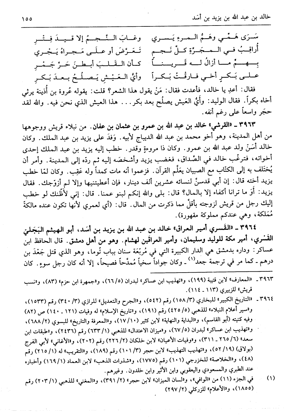 خَالِد بن عبد الله بن يزِيد بن أَسد أَبُو الْهَيْثَم البجليّ الْقَسرِي أَمِير مَكَّة للوليد وَسليمَان وأمير العراقين لهشام وَهُوَ من أهل دمشق قَالَ الْحَافِظ ابْن عَسَاكِر وداره بِدِمَشْق هِيَ الدَّار الْكَبِيرَة الَّتِي مربّعة سِنَان بِبَاب توما وَهُوَ الَّذِي قتل جعد ابْن دِرْهَم كَمَا مر فِي تَرْجَمَة جعد وَكَانَ جواداً سخياً ممدَّحاً فصيحاً إِلَّا أَنه كَانَ رجل سوءٍ كَانَ