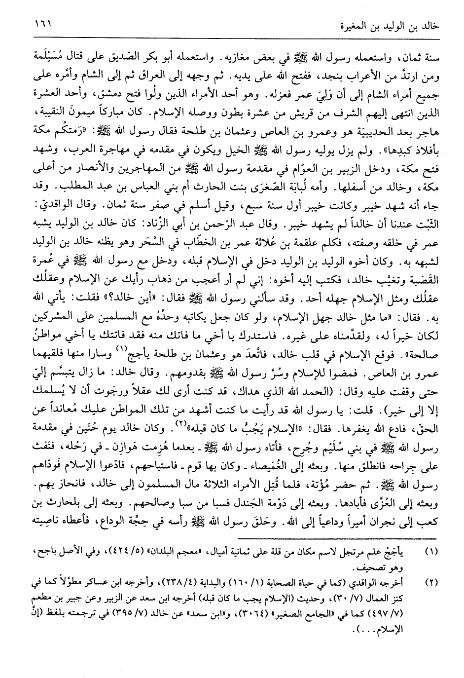 كَانَ مُبَارَكًا مَيْمُون النقيبة هَاجر بعد الْحُدَيْبِيَة هُوَ وَعَمْرو ابْن الْعَاصِ وَعُثْمَان بن طَلْحَة فَقَالَ رَسُول الله صلى الله عَلَيْهِ وَسلم رمتكم مَكَّة بأفلاذ كَبِدهَا وَلم يزل يوليه رَسُول الله صلى الله عَلَيْهِ وَسلم الْخَيل وَيكون فِي مقدمه فِي مهاجرة الْعَرَب وَشهد فتح مَكَّة وَدخل الزبير بن العّوام فِي مُقَدّمَة رَسُول الله صلى الله عَلَيْهِ وَسلم من الْمُهَاجِرين وَالْأَنْصَار من أَعلَى مَكَّة وخَالِد من أَسْفَلهَا وَأمه لبَابَة الصّغرى بنت الْحَارِث أم بني الْعَبَّاس بن عبد الْمطلب وَقد جَاءَ أَنه شهد خَيْبَر وَكَانَت خَيْبَر أول سنة سبع وَقيل أسلم فِي صفر سنة ثَمَان وَقَالَ الواقديّ الثّبت عندنَا أَن خَالِدا لم يشْهد خَيْبَر وَقَالَ عبد الرَّحْمَن بن أبي الزِّناد كَانَ خَالِد بن أبي الْوَلِيد يشبه عمر فِي خلقه وَصفته فَكلم عَلْقَمَة بن علاثة عمر بن الخطّاب فِي السِّحر وَهُوَ يَظُنّهُ خَالِد بن الْوَلِيد لشبهه بِهِ وَكَانَ أَخُوهُ الْوَلِيد بن الْوَلِيد دخل فِي الْإِسْلَام قبله وَدخل مَعَ رَسُول الله صلى الله عَلَيْهِ وَسلم فِي عمْرَة القصبة وتغيَّب خَالِد فَكتب إِلَيْهِ أَخُوهُ إِنِّي لم أر أعجب من ذهَاب رَأْيك عَن الْإِسْلَام وعقلك عقلك وَمثل الْإِسْلَام جَهله أحد وَقد سَأَلَني رَسُول الله صلى الله عَلَيْهِ وَسلم فَقَالَ أَي خَالِد فَقلت يَأْتِي الله بِهِ فَقَالَ مَا مثل خَالِد جهل الْإِسْلَام وَلَو كَانَ جعل يكاتبه وَحده مَعَ الْمُسلمين على الْمُشْركين لَكَانَ خيرا لَهُ ولقدّمناه على غَيره فاستدرك يَا أخي مَا فاتك مِنْهُ فقد فاتتك يَا أخي مَوَاطِن صَالِحَة فَوَقع الْإِسْلَام فِي قلب خَالِد فاتَّعد هُوَ وَعُثْمَان بن طَلْحَة باجح وسارا مِنْهَا فلقيهما عَمْرو بن الْعَاصِ فَمَضَوْا لِلْإِسْلَامِ وسرَّ رَسُول الله صلى الله عَلَيْهِ وَسلم بقدومهم وَقَالَ خَالِد مَا زَالَ يتبسَّم إليّ حَتَّى وقفت عَلَيْهِ وَقَالَ الْحَمد لله الَّذِي هداك قد كنت أرى لَك عقلا ورجوت أَن لَا يسلومك إِلَّا إِلَى خير قلت يَا رَسُول الله قد رَأَيْت مَا كنت أشهد من تِلْكَ المواطن عَلَيْك ومعانداً عَن الحقّ فَادع الله يغفرها فَقَالَ الْإِسْلَام يجبُّ مَا كَانَ قبله وَكَانَ خَالِد يَوْم حنين فِي مُقَدّمَة رَسُول الله صلى الله عَلَيْهِ وَسلم فِي بني)