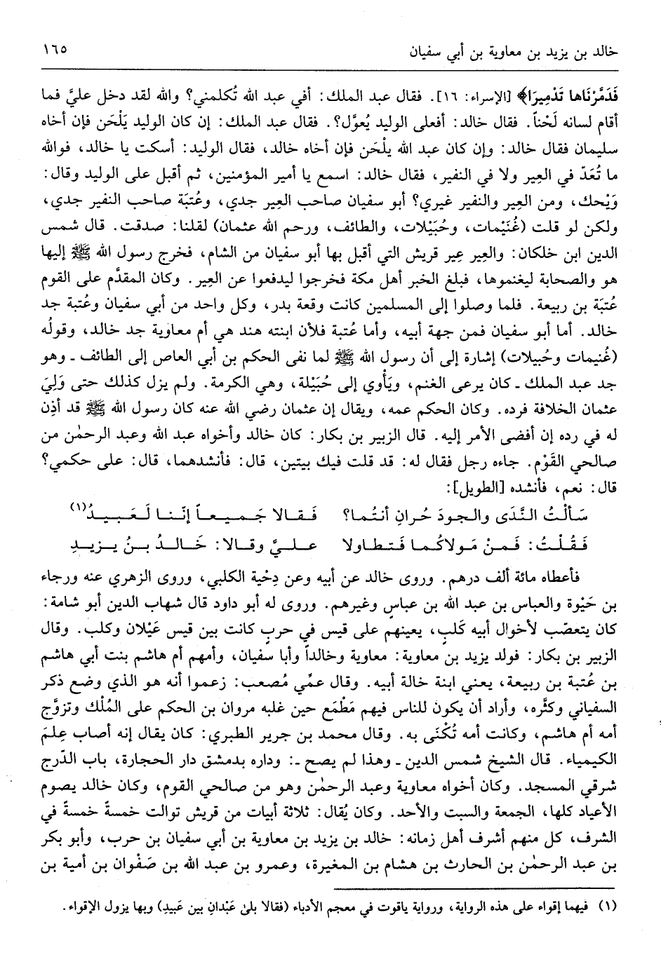 أما أَبُو سُفْيَان فَمن جِهَة أَبِيه وَأما عتبَة فَلِأَن ابْنَته هِنْد هِيَ أم مُعَاوِيَة جد خَالِد وَقَوله غنيمات وحبيلات إِشَارَة إِلَى أَن رَسُول الله صلى الله عَلَيْهِ وَسلم لما نفى الحكم بن أبي الْعَاصِ إِلَى الطَّائِف وَهُوَ جد عبد الْملك كَانَ يرْعَى الْغنم ويأوي إِلَى حبيلة وَهِي الكرمة وَلم يزل كَذَلِك حَتَّى ولي عُثْمَان الْخلَافَة فَرده وَكَانَ الحكم عَمه وَيُقَال أَن عُثْمَان رَضِي الله عَنهُ كَانَ رَسُول الله صلى الله عَلَيْهِ وَسلم قد أذن لَهُ فِي رده إِن أفْضى الْأَمر إِلَيْهِ قَالَ الزبير بن بكار كَانَ خَالِد وأخواه عبد الله وَعبد الرَّحْمَن من صالحي الْقَوْم جَاءَهُ رجل فَقَالَ لَهُ قد قلت فِيك بَيْتَيْنِ قَالَ فأنشدهما قَالَ على حكمي قَالَ نعم فأنشده من الطَّوِيل