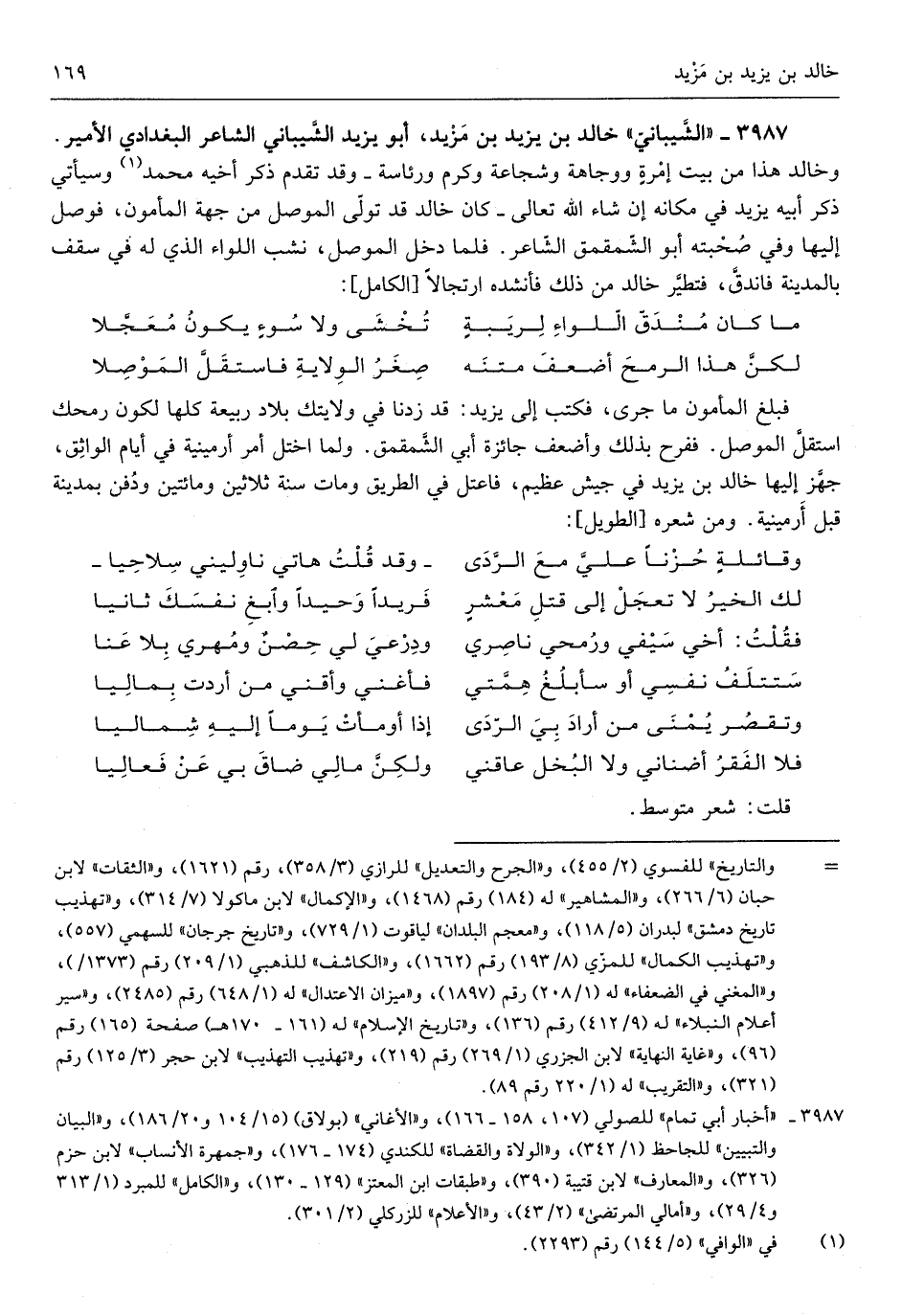 خَالِد بن يزِيد بن مزِيد أَبُو يزِيد الشِّيباني الشَّاعِر الْبَغْدَادِيّ الْأَمِير وخَالِد هَذَا من بَيت إمرةٍ ووجاهة وشجاعة وكرم ورئاسة وَقد تقدم ذكر أَخِيه مُحَمَّد وَسَيَأْتِي ذكر أَبِيه يزِيد فِي مَكَانَهُ إِن شَاءَ الله تَعَالَى كَانَ خَالِد قد تولّى الْموصل من جِهَة الْمَأْمُون فوصل إِلَيْهَا وَفِي صحبته أَبُو الشّمقيق الشّاعر فَلَمَّا دخل الْموصل نشب اللِّوَاء الَّذِي لَهُ فِي سقف بِالْمَدِينَةِ فاندقَّ فتطيَّر خَالِد من ذَلِك فأنشده ارتجالاً من الْكَامِل