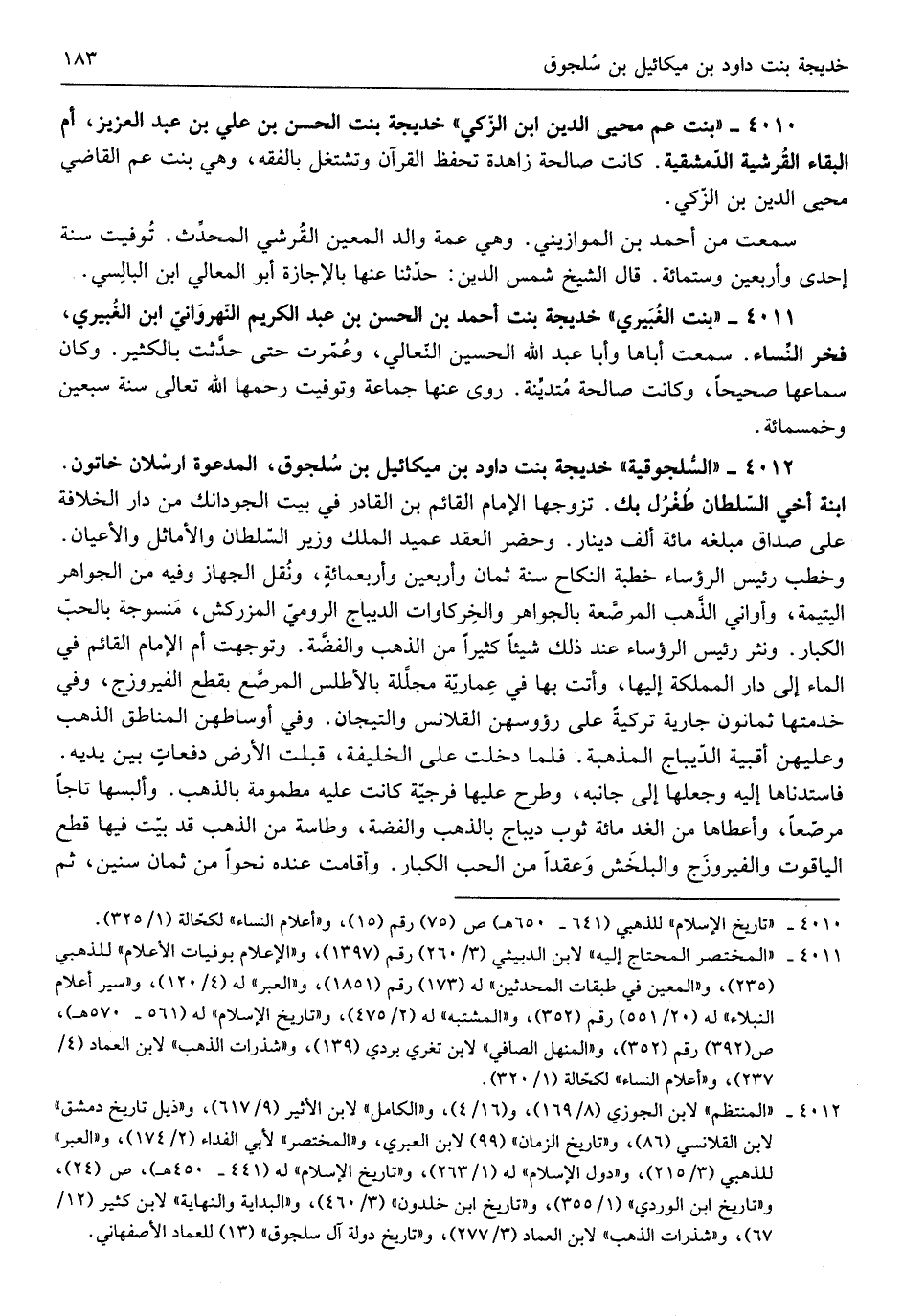 خَدِيجَة بنت الْحسن بن عَليّ بن عبد الْعَزِيز أم الْبَقَاء القرشية الدّمشقية كَانَت صَالِحَة زاهدة تحفظ الْقُرْآن وتشتغل بالفقه وَهِي بنت عَم القَاضِي محيى الدّين بن الزّكي سَمِعت من أَحْمد بن الموازيني وَهِي عمَّة وَالِد الْمعِين الْقرشِي المحدِّث توفيت سنة إِحْدَى وَأَرْبَعين وست مائَة)