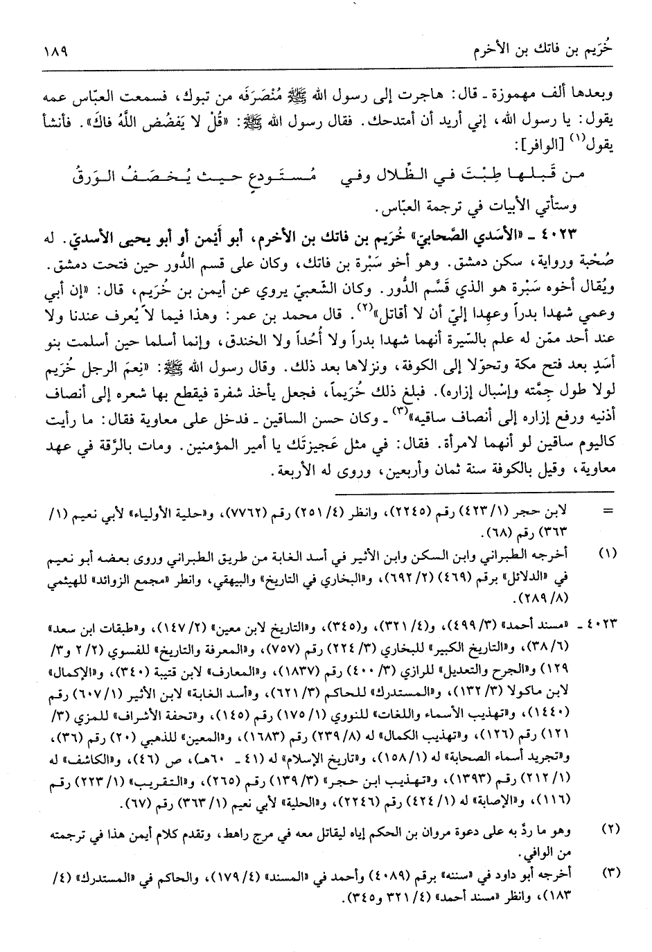 وَهُوَ أَخُو سُبْرَة بن فاتك وَكَانَ على قسم الدُّور حِين فتحت دمشق وَيُقَال أَخُوهُ سُبْرَة هُوَ الَّذِي قسَّم الدُّور وَكَانَ الشّعبيّ يروي عَن أَيمن بن خريمٍ قَالَ إِن أبي وَعمي شَهدا بَدْرًا وعهدا إليّ أَن لَا أقَاتل قَالَ مُحَمَّد ابْن عمر وَهَذَا فِيمَا لَا يتعرف عندنَا وَلَا عِنْد أحد ممّن لَهُ علم بالسّيرة أَنَّهُمَا شَهدا بَدْرًا وَلَا أحدا وَلَا الخَنْدَق وَإِنَّمَا أسلما حِين أسلمت بَنو أسدٍ بعد فتح مَكَّة وتحوّلا إِلَى الْكُوفَة ونزلاها بعد ذَلِك وَقَالَ رَسُول الله صلى الله عَلَيْهِ وَسلم نعم الرجل خريم لَوْلَا طول جمَّته وإسبال إزَاره فَبلغ ذَلِك خريماً فَجعل يَأْخُذ شفرة فَيقطع بهَا شعره إِلَى أَنْصَاف أُذُنَيْهِ وَرفع إزَاره إِلَى أَنْصَاف سَاقيه وَكَانَ حسن السَّاقَيْن فَدخل على مُعَاوِيَة فَقَالَ مَا رَأَيْت كَالْيَوْمِ ساقين لَو أَنَّهُمَا لامْرَأَة فَقَالَ فِي مثل عجيزتك يَا أَمِير الْمُؤمنِينَ وَمَات بالرقَّة فِي عهد مُعَاوِيَة وَقيل بِالْكُوفَةِ سنة ثَمَان وَأَرْبَعين وروى لَهُ الْأَرْبَعَة