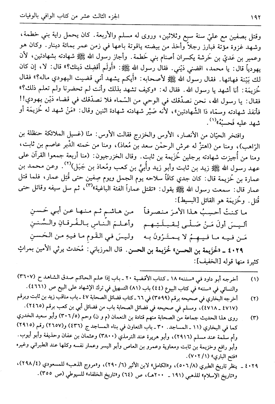 وَقتل بصفين مَعَ عليّ سنة سبع وَثَلَاثِينَ وروى لَهُ مُسلم والأبعة كَانَ يحمل راية بني خطمة وَشهد غَزْوَة مُؤْتَة فبارز رجلا فقلته وَأخذ من بيضته ياقوتة بَاعهَا فِي زمن عمر بِمِائَة دِينَار وَكَانَ هُوَ وَعُمَيْر بنعديّ بن خَرشَة يكسران أصنام بني خطمة وَأَجَازَ رَسُول الله صلى الله عَلَيْهِ وَسلم شَهَادَته بشهادتين لِأَن يَهُودِيّا قَالَ يَا مُحَمَّد أقضني ديني فَقَالَ رَسُول الله صلى الله عَلَيْهِ وَسلم أولم أقضك دينك قَالَ لَا إِن كَانَ لَك بَيِّنَة فهاتها فَقَالَ رَسُول الله صلى الله عَلَيْهِ وَسلم لأَصْحَابه أَيّكُم يشْهد أَنِّي قضيت الْيَهُودِيّ مَاله فَقَالَ خُزَيْمَة أَنا أشهد يَا رَسُول الله فَقَالَ لَهُ وَكَيف تشهد بذلك وَأَنت لم تحضرنا وَلم تعلم ذَلِك فَقَالَ يَا رَسُول الله نَحن نصدِّقك فِي الْوَحْي من السّماء فَلَا نصدّقك فِي قَضَاء دين يَهُودِيّ فأنفذ شَهَادَته وسمّاه ذَا الشَّهادتين لِأَنَّهُ صيَّر شَهَادَته شَهَادَة اثْنَيْنِ وَقَالَ من شهد لَهُ خُزَيْمَة أَو شهد عَلَيْهِ فحسبه