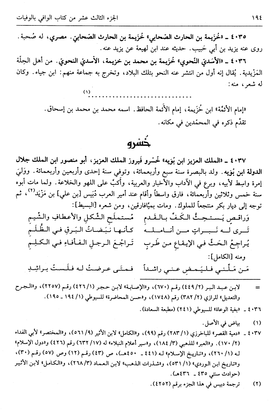 خسرو فَيْرُوز الْملك الْعَزِيز أَبُو مَنْصُور ابْن الْملك جلال الدولة ابْن بويه ولد بِالْبَصْرَةِ سنة سبع وَأَرْبع مائَة وَتُوفِّي سنة إِحْدَى وَأَرْبَعين وَأَرْبع مائَة وَولي إمرة وَاسِط لِأَبِيهِ وبرع فِي الْآدَاب وَالْأَخْبَار الْعَرَبيَّة وأكبَّ على اللَّهْو والخلاعة وَلما مَاتَ أَبُو سنة خمس وَثَلَاثِينَ وَأَرْبع مائَة فَارق واسطاً وَأقَام عِنْد أَمِير الْعَرَب دبيس بن مزِيد ثمَّ توجه إِلَى ديار بكر منتجعاً للملوك وَمَات بميَّافارقين وَمن شعره من الْبَسِيط
