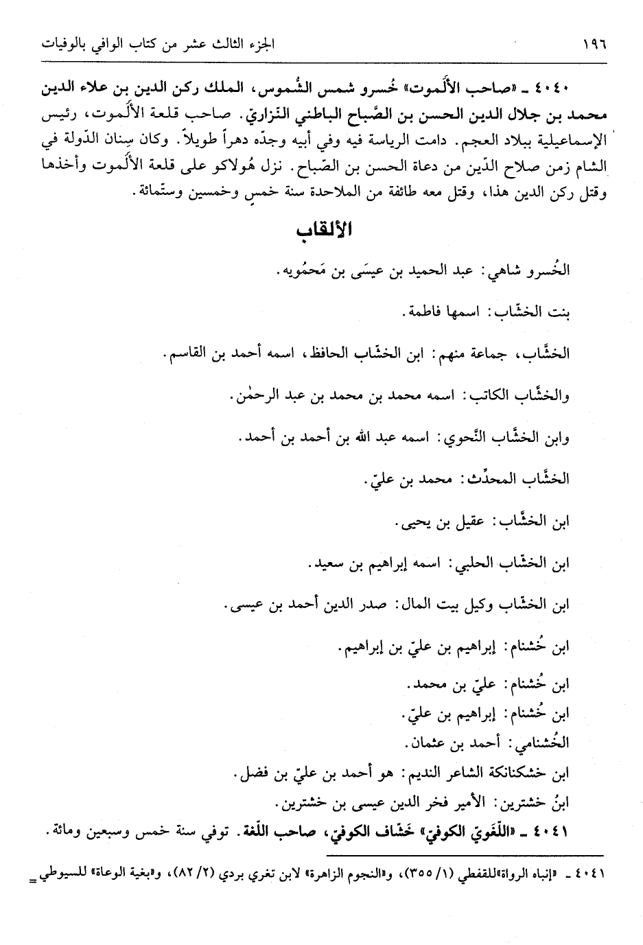 خسرو شمس الشُّموس الْملك ركن الدّين ابْن عَلَاء الدّين مُحَمَّد بن جلال الدّين الْحسن بن الصَّباح الباطني النّزاريّ صَاحب قلعة الألموت رَئِيس الإسماعيلية بِبِلَاد الْعَجم دَامَت الرياسة فِيهِ وَفِي أَبِيه وجدّه دهراً طَويلا وَكَانَ سِنَان الدّولة فِي الشَّام زمن صَلَاح الدّين من دعاة الْحسن بن الصّباح نزل هولاكو على قلعة الألموت وَأَخذهَا وَقتل ركن الدّين هَذَا وَقتل مَعَه طَائِفَة من الْمَلَاحِدَة سنة خمسٍ وَخمسين وستّ مائَة