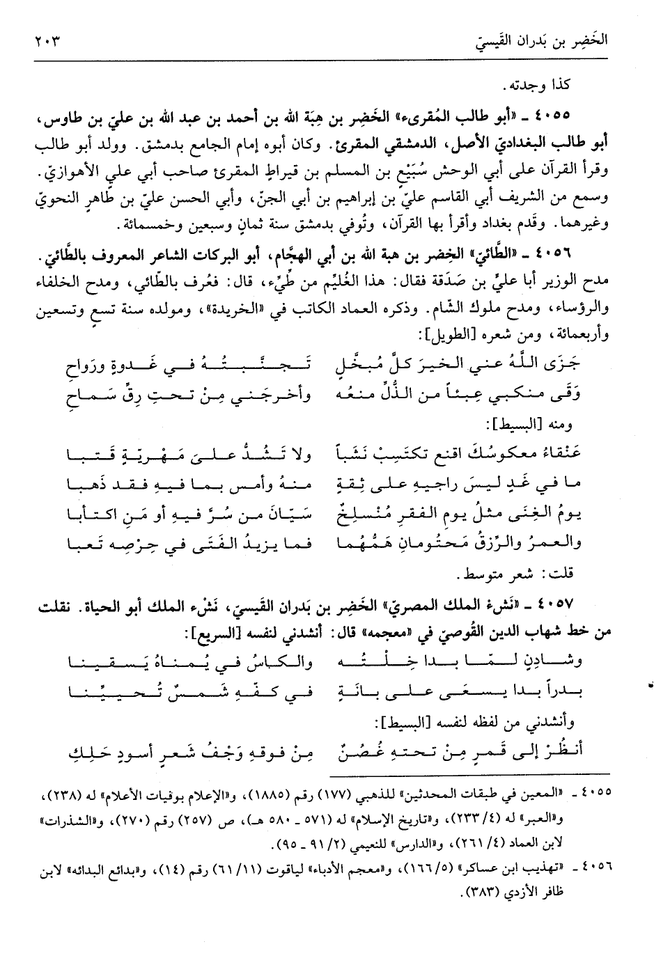 الْخضر بن هبة الله بن أبي الهجَّام أَبُو البركات الشَّاعِر الْمَعْرُوف بالطَّائيّ مدح الْوَزير أَبَا عليٍّ صَدَقَة فَقَالَ هَذَا الغليِّم من طيِّء قَالَ فَعرف بالطّائي ومدح الْخُلَفَاء والرؤساء ومدح مُلُوك الشّام وَذكره الْعِمَاد الْكَاتِب فِي الخريدة ومولده سنة تسعٍ وَتِسْعين وَأَرْبع مائَة وَمن شعره من الطَّوِيل