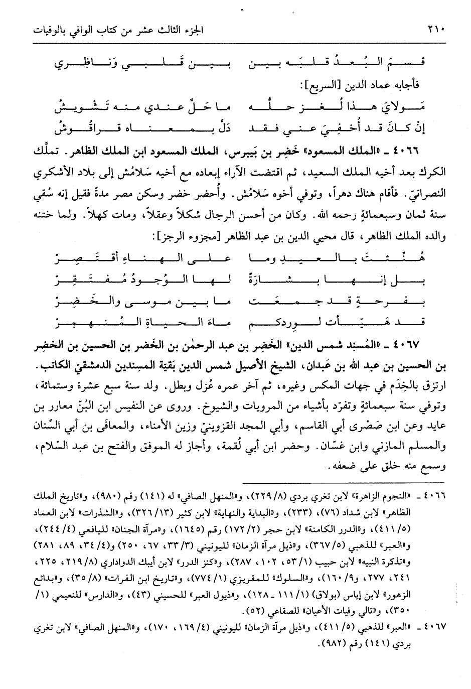 خضر بن بيبرس الْملك المسعود ابْن الْملك الظَّاهِر تملَّك الكرك بعد أَخِيه الْملك السعيد ثمَّ اقْتَضَت الآراء إبعاده مَعَ أَخِيه سلامش إِلَى بِلَاد الأشكري النصرانيّ فَأَقَامَ هُنَاكَ دهراً وَتُوفِّي أَخُوهُ سلامش وأحضر خضر وَسكن مصر مُدَّة فَقيل أَنه سقِِي سنة ثَمَان وَسبع مائةٍ رَحمَه اللاه وَكَانَ من أحسن الرِّجَال شكلاً وعقلاً وَمَات كهلاً وَلما ختنه وَالِده الْملك الظَّاهِر قَالَ محيي الدّين بن عبد الظَّاهِر من الرجز
