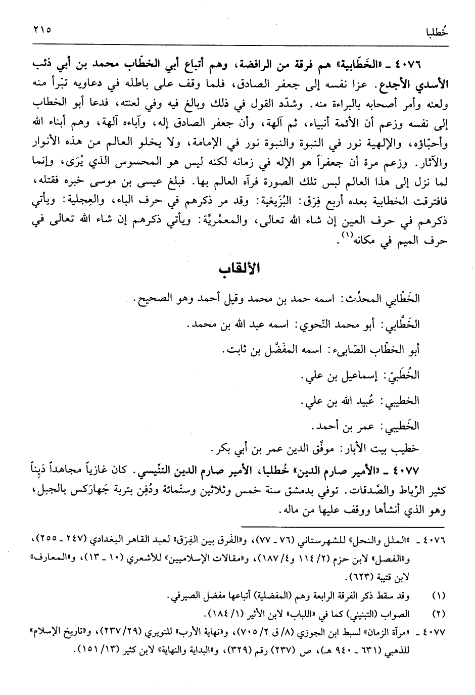 هم فرقة من الرافضة وهم أَتبَاع أبي الخطّاب مُحَمَّد بن أبي ذِئْب الْأَسدي الأجدع عزا نَفسه إِلَى جَعْفَر الصَّادِق فَلَمَّا وقف على باطله فِي دعاويه تبرّأ مِنْهُ ولعنه وَأمر أَصْحَابه بِالْبَرَاءَةِ مِنْهُ وشدّد القَوْل فِي ذَلِك وَبَالغ فِيهِ وَفِي لعنته فَدَعَا أَبُو الْخطاب إِلَى نَفسه وَزعم أَن الْأَئِمَّة أَنْبيَاء ثمَّ آلِهَة وَأَن جَعْفَر الصَّادِق آله وآباه آلِهَة وهم أَبنَاء الله وأحبّاؤه والإلهية نور فِي النُّبُوَّة والنبوة نور فِي الْإِمَامَة وَلَا يَخْلُو الْعَالم من هَذِه الْأَنْوَار والْآثَار وَزعم مرّة أَن جعفراً هُوَ الآله فِي زَمَانه لكنه لَيْسَ هُوَ المحسوس الَّذِي يرى وَإِنَّمَا لما نزل إِلَى هَذَا الْعَالم لبس تِلْكَ الصُّور فَرَآهُ الْعَالم بهَا فبيلغ عِيسَى بن مُوسَى خَبره فَقتله فافترقت الخطابية بعده أَربع فرق البزيغية وَقد مرذكرهم فِي حرف الْبَاء والعجلية وَيَأْتِي ذكرهم فِي حرف الْعين إِن شَاءَ الله تَعَالَى والمعمَّريَّة وَيَأْتِي ذكرهم إِن شَاءَ الله تَعَالَى فِي حرف الْمِيم فِي مَكَانَهُ