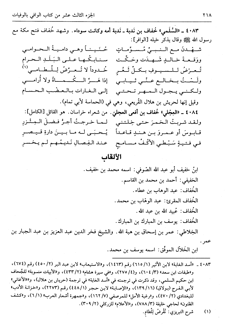 خفاف بن ندبة ندبة أمه وَكَانَت سَوْدَاء وَشهد خفاف فتح مَكَّة مَعَ رَسُول الله صلى الله عَلَيْهِ وَسلم وَقَالَ يذكر خيله من الوافر