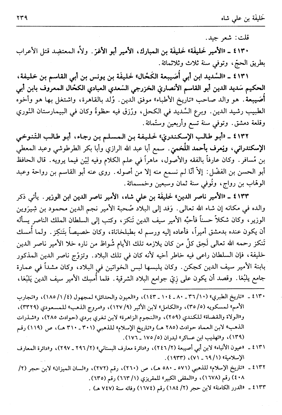 خَليفَة بن عَليّ شاه الْأَمِير نَاصِر الدّين ابْن الْوَزير يَأْتِي ذكر وَالِده فِي مَكَانَهُ إِن شَاءَ الله تَعَالَى وَفد إِلَى الْبِلَاد صُحْبَة الْأَمِير نجم الدّين مَحْمُود بن شيروين الْوَزير وَكَانَ شكلاً حسنا فأحبَّه الْأَمِير سيف الدّين تنكز وَكتب إِلَى السُّلْطَان الْملك النَّاصِر يسْأَله أَن يكون عِنْده بِدِمَشْق أَمِيرا فَأَعَادَهُ إِلَيْهِ ورسم لَهُ بطبلخاناة وَكَانَ خصيصاً بتنكز وَلما أمسك تنكز رَحمَه الله تَعَالَى لحق كلَّ من كَانَ يلازمه تِلْكَ الْأَيَّام شواظ من ناره خلا الْأَمِير نَاصِر الدّين خَليفَة فَإِن السُّلْطَان رَاعى فِيهِ خاطر أَخِيه لِأَنَّهُ كَانَ فِي تِلْكَ الْبِلَاد وتزوّج نَاصِر الدّين الْمَذْكُور بابنة الْأَمِير سيف الدّين كجكن وَكَانَ يلبسهَا لبس الخواتين فِي الْبِلَاد وَكَانَ مشداً فِي عمَارَة جَامع يلبغا وَقصد أَن يكون على زيّ جَوَامِع الْبِلَاد الشرقية فَلَمَّا أمسك الْأَمِير سيف الدّين يلبغ