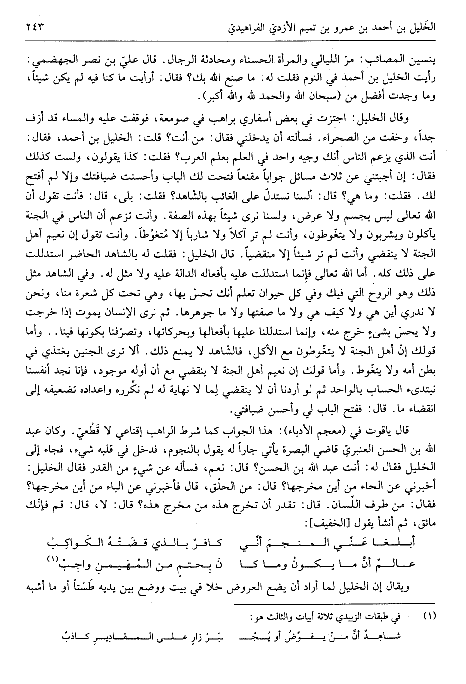وَقَالَ الْخَلِيل اجتزت فِي بعض أسفاري براهب فِي صومعة فوقفت عَلَيْهِ والمساء قد أزف جدا وَخفت من الصَّحرَاء فَسَأَلته أَن يدخلني فَقَالَ من أَنْت قلت الْخَلِيل بن أَحْمد فَقَالَ أَنْت الَّذِي يزْعم النَّاس أَنَّك وجيه وَاحِد فِي الْعلم بِعلم الْعَرَب فَقلت كَذَا يَقُولُونَ وَلست كَذَلِك فَقَالَ إِن أجبتني عَن ثَلَاث مسَائِل جَوَابا مقنعا فتحت لَك الْبَاب وأحسنت ضيافتك وَإِلَّا لم أفتح لَك