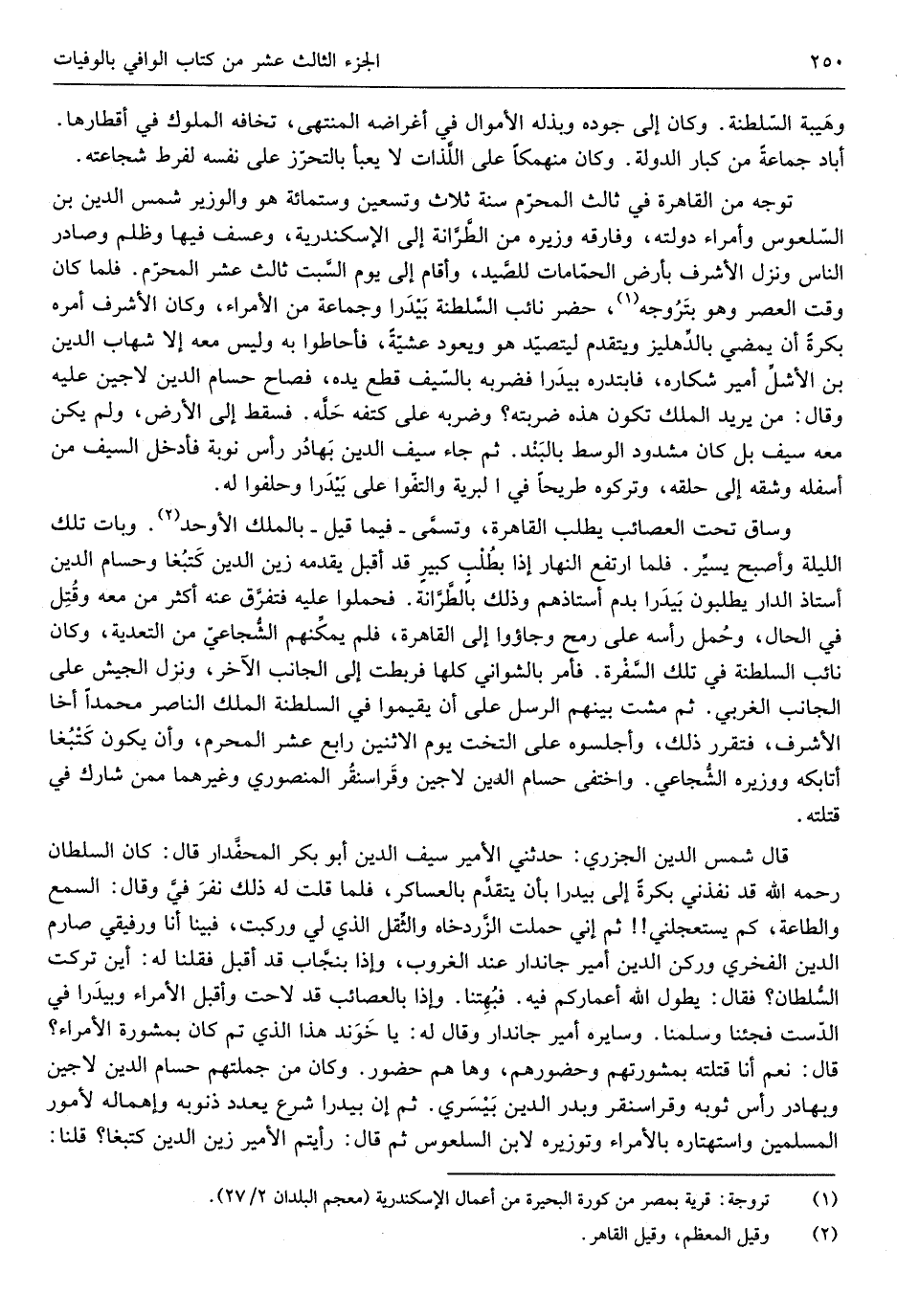 توجَّه من الْقَاهِرَة فِي ثَالِث المحرّم سنة ثَلَاث وَتِسْعين وست مائَة هُوَ والوزير شمس الدّين بن السّلعوس وأمراء دولته وفارقه وزيره من الطَّرَّانة إِلَى الْإسْكَنْدَريَّة وعسف فِيهَا وظلم وصادر النَّاس وَنزل الْأَشْرَف بِأَرْض الحمّامات للصَّيد وَأقَام إِلَى يَوْم السَّبت ثَالِث عشر المحرّم فَلَمَّا كَانَ وَقت الْعَصْر وَهُوَ بتروجه حضر نَائِب السَّلطنة بيدرا وَجَمَاعَة من الْأُمَرَاء وَكَانَ الْأَشْرَف أمره بكرَة أَن يمْضِي بالدِّهليز ويتقدم ليتصيّد هُوَ وَيعود عشيّةً فأحاطوا بِهِ وَلَيْسَ مَعَه إِلَّا شهَاب الدّين ابْن الأشلِّ أَمِير شكاره فَابْتَدَرَهُ بيدرا فَضَربهُ بالسّيف قطع يَده فصاح حسام الدّين لاجين عَلَيْهِ وَقَالَ من يُرِيد الْملك تكون هَذِه ضَربته وضربه على كتفه حلَّه فَسقط إِلَى الأَرْض وَلم يكن مَعَه سيف بل كَانَ مشدود الْوسط بالبند ثمَّ جَاءَ سيف الدّين بهادر رَأس نوبَة فَأدْخل السَّيْف من أَسْفَله وَشقه إِلَى حلقه وتركوه طريحاً فِي الْبَريَّة والتفّوا على بيدرا وحلفوا لَهُ