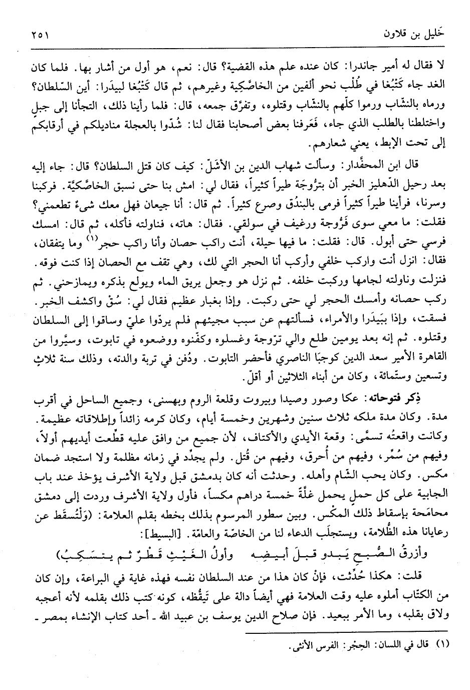 قَالَ ابْن المحفَّدار وَسَأَلت شهَاب الدّين ابْن الأشلّ كَيفَ كَانَ قتل السُّلْطَان قَالَ جَاءَ إِلَيْهِ بعد رحيل الدّهليز الْخَبَر أَن بترُّوجة طيراً كثيرا فَقَالَ لي امش بِنَا حَتَّى نسبق الخاصَّكيَّة فَرَكبْنَا وسرنا فَرَأَيْنَا طيراً كثيرا فَرمى بالبندق وصرع كثيرا ثمَّ قَالَ أَنا جيعان فَهَل مَعَك شيءٌ تطعمني فَقلت مَا معي سوى فرُّوجة ورغيف فِي سولقي فَقَالَ هاته فناولته فَأَكله ثمَّ قَالَ امسك فرسي حَتَّى أبول قَالَ فَقلت مَا فِيهَا حِيلَة أَنْت رَاكب حصان وَأَنا رَاكب حجر وَمَا)