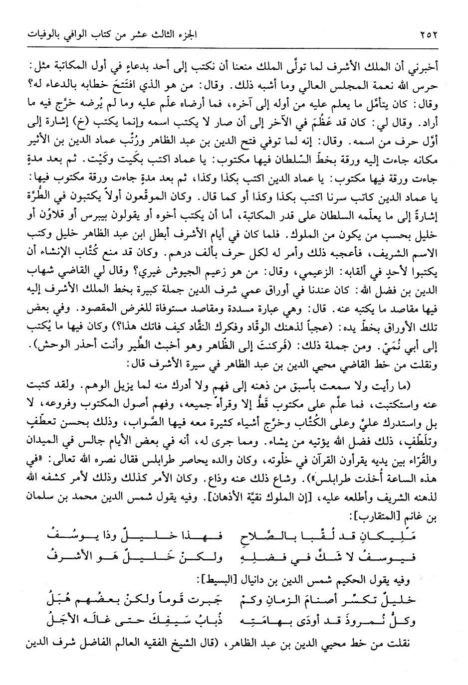 ثمَّ بعد مدةٍ جَاءَت ورقة فِيهَا مَكْتُوب يَا عماد الدّين اكْتُبْ بِكَذَا وَكَذَا ثمَّ بعد مدةٍ جَاءَت ورقة مَكْتُوب فِيهَا يَا عماد الدّين كَاتب سرنا اكْتُبْ بِكَذَا وَكَذَا أَو كَمَا قَالَ وَكَانَ الموقّعون أَولا يَكْتُبُونَ فِي الطُّرَّة إِشَارَة إِلَى مَا يعلّمه السُّلْطَان على قدر الْمُكَاتبَة أما أَن يكْتب أَخُوهُ أَو يَقُولُونَ بيبرس أَو قلاون أَو خَلِيل بِحَسب من يكون من الْمُلُوك فَلَمَّا كَانَ فِي أَيَّام الْأَشْرَف أبطل ابْن عبد الظَّاهِر خَلِيل وَكتب الِاسْم الشريف فأعجبه ذَلِك وَأمر لَهُ لكل حرف بِأَلف دِرْهَم وَكَانَ قد منع كتَّاب الْإِنْشَاء أَن يكتبوا لأحدٍ فِي ألقابه الزعيمي وَقَالَ من هُوَ زعيم الجيوش غَيْرِي وَقَالَ لي القَاضِي شهَاب الدّين بن فضل الله كَانَ عندنَا فِي أوراق عمي شرف الدّين جملَة كَبِيرَة بِخَط الْملك الْأَشْرَف إِلَيْهِ فِيهَا مَقَاصِد مَا يَكْتُبهُ عَنهُ قَالَ وَهِي عبارَة مسددة ومقاصد مستوفاة للغرض الْمَقْصُود وَفِي بعض تِلْكَ الأوراق بخطّ يَده عجبا لذهنك الوقّاد وفكرك النقَّاد كَيفَ فاتك هَذَا وَكَانَ فِيهَا مَا يكْتب إِلَى أبي نميّ وَمن جملَة ذَلِك فركنت إِلَى الظّاهر وَهُوَ أَخبث الطَّير وَأَنت أحذر الْوَحْش ونقلت من خطّ القَاضِي محيي الدّين بن عبد الظَّاهِر فِي سيرة الْأَشْرَف قَالَ مَا رَأَيْت وَلَا سَمِعت بأسبق من ذهنه إِلَى فهمٍ وَلَا أدْرك مِنْهُ لما يزِيل الْوَهم وَلَقَد كتبت عَنهُ واستكتبت فَمَا علَّم على مَكْتُوب قطُّ إِلَّا وقرأه جَمِيعه وَفهم أصُول الْمَكْتُوب وفروعه لَا بل واستدرك عليَّ وعَلى الكتَّاب وخرَّج أَشْيَاء كَثِيرَة مَعَه فِيهَا الصَّواب وَذَلِكَ بِحسن تعطّفٍ وتلطفٍ ذَلِك فضل الله يؤتيه من يَشَاء وَمِمَّا جرى لَهُ أَنه فِي بعض الْأَيَّام جَالس فِي الميدان والقرّاء بَين يَدَيْهِ يقرأون الْقُرْآن فِي خلوته وَكَانَ وَالِده يحاصر طرابلس فَقَالَ نَصره الله تَعَالَى فِي هَذِه السَّاعَة أخذت طرابلس وشاع ذك عَنهُ وذاع وَكَانَ الْأَمر كَذَلِك وَذَلِكَ لأمر كشفه الله لذهنه الشريف وأطلعه عَلَيْهِ إِن الْمُلُوك نقيَّة الأذهان وَفِيه يَقُول شمس الدّين مُحَمَّد بن سلمَان بن غانمٍ من المتقارب