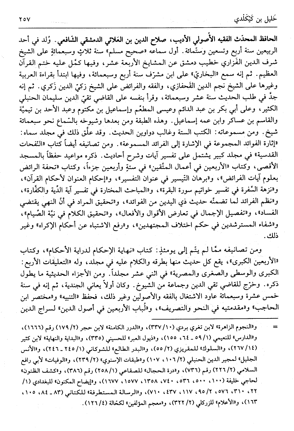 الْحَافِظ المحدّث الْفَقِيه الأصولي الأديب صَلَاح الدّين بن العلائي الدِّمَشْقِي الشّافعي ولد فِي أحد الربيعين سنة أَربع وَتِسْعين وستّ مائَة أول سَمَاعه صَحِيح مُسلم سنة ثلاثٍ وَسبع مائةٍ على الشَّيْخ شرف الدّين الْفَزارِيّ خطيب دمشق عَن الْمَشَايِخ الْأَرْبَعَة عشر وفيهَا كمَّل عَلَيْهِ ختم الْقُرْآن الْعَظِيم ثمَّ إِنَّه سمع البخاريّ على ابْن مشرّف سنة أَربع وَسبع مائَة وفيهَا ابْتَدَأَ بِقِرَاءَة الْعَرَبيَّة وَغَيرهَا على الشَّيْخ نجم الدّين القحفازي وَالْفِقْه والفرائض على الشَّيْخ زكيّ الدّين زكري ثمَّ إِنَّه جدَّ فِي طلب الحَدِيث سنة عشر وَسبع مائَة وَقَرَأَ بِنَفسِهِ على القَاضِي تقيّ الدّين سُلَيْمَان الْحَنْبَلِيّ الْكثير وعَلى أبي بكر بن عبد الدَّائِم وَعِيسَى المطعِّم وَإِسْمَاعِيل بن مَكْتُوم وَعبد الْأَحَد بن تيميَّة وَالقَاسِم بن عَسَاكِر وَابْن عَمه إِسْمَاعِيل وَهَذِه الطَّبَقَة وَمن بعْدهَا وشيوخه بالسّماع نَحْو سبع مائَة شيخ وَمن مسموعاته الْكتب السِّتَّة وغالب دواوين الحَدِيث وَقد علَّق ذَلِك فِي مُجَلد سَمَّاهُ إثارة الْفَوَائِد الْمَجْمُوعَة فِي الْإِشَارَة إِلَى الفرائد المسموعة وَمن تصانيفه أَيْضا كتاب النّفحات القدسية فِي مُجَلد كَبِير يشْتَمل على تَفْسِير آيَات وَشرح أَحَادِيث ذكره مواعيد حفظا بِالْمَسْجِدِ الْأَقْصَى وَكتاب الْأَرْبَعين فِي أَعمال الْمُتَّقِينَ فِي سِتَّة وَأَرْبَعين جُزْءا وَكتاب تحفة الرائض بعلوم آيَات الْفَرَائِض وبرهان التّيسير فِي عنوان التَّفْسِير وإحكام العنوان لأحكام الْقُرْآن ونزهة السَّفرة فِي تَفْسِير خَوَاتِيم سُورَة الْبَقَرَة والمباحث المختارة فِي تَفْسِير آيَة الدِّية والكفَّارة ونظم الفرائد لما تضمَّنه حَدِيث ذِي الْيَدَيْنِ من الْفَوَائِد وَتَحْقِيق المُرَاد فِي أنّ النَّهْي يَقْتَضِي الْفساد وتفصيل الْإِجْمَال فِي تعَارض الْأَقْوَال وَالْأَفْعَال وَتَحْقِيق الْكَلَام فِي نيَّة الصِّيام وشفاء المسترشدين فِي حكم اخْتِلَاف الْمُجْتَهدين وَرفع الِاشْتِبَاه عَن أَحْكَام الْإِكْرَاه وَغير ذَلِك