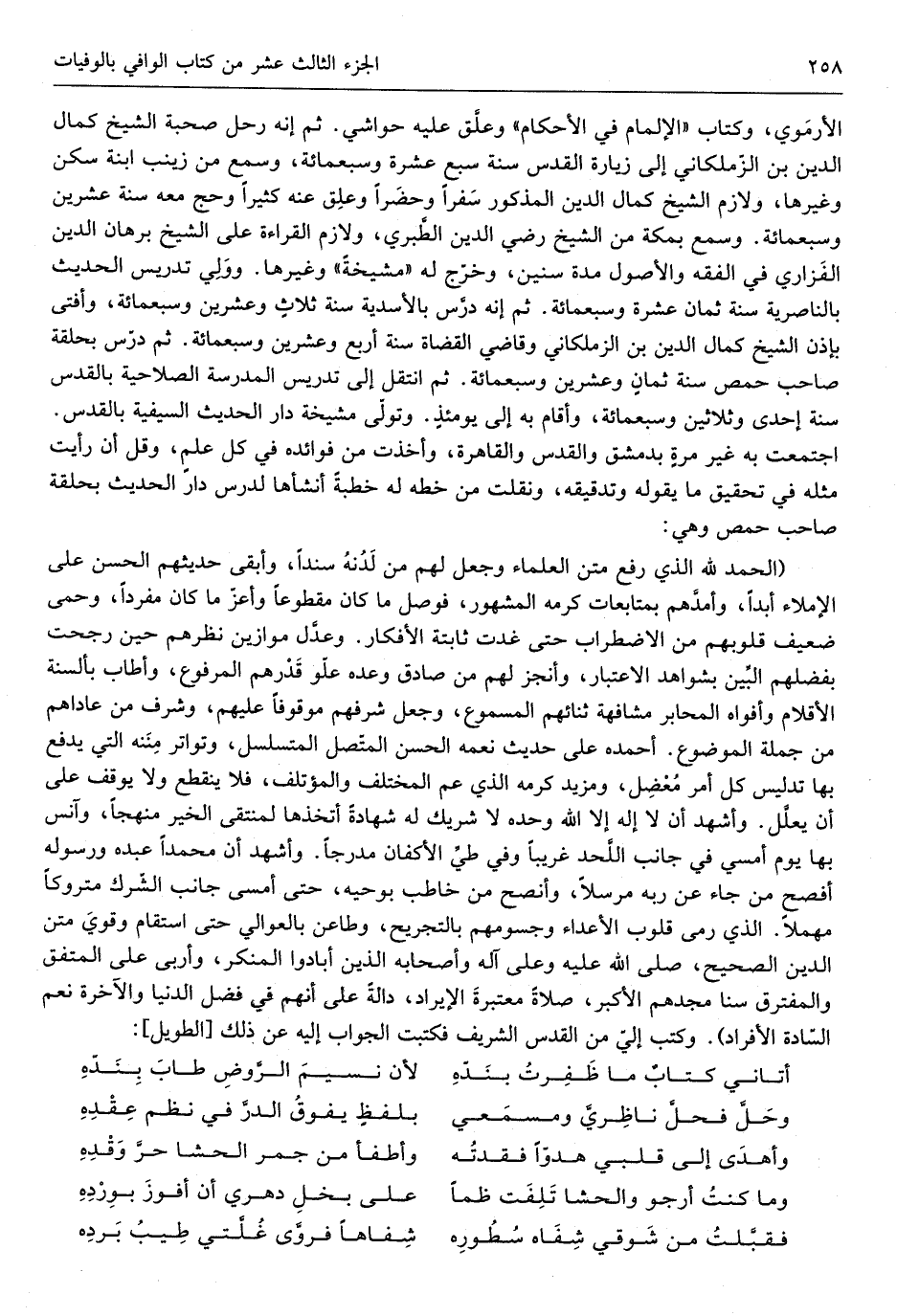 الأرموي وَكتاب الْإِلْمَام فِي الْأَحْكَام وعلَّق عَلَيْهِ حَوَاشِي ثمَّ إِنَّه رَحل صُحْبَة الشَّيْخ كَمَال الدّين بن الزّملكاني إِلَى زِيَارَة الْقُدس سنة سبع عشرَة وَسبع مائَة وَسمع من زَيْنَب ابْنة سكن وَغَيرهَا ولازم الشَّيْخ كَمَال الدّين الْمَذْكُور سفرا وحضراً وعلق عَنهُ كثيرا وَحج مَعَه سنة عشْرين وَسبع مائَة وَسمع بِمَكَّة من الشَّيْخ رَضِي الدّين الطَّبري ولازم الْقِرَاءَة على الشَّيْخ برهَان الدّين الْفَزارِيّ فِي الْفِقْه وَالْأُصُول مُدَّة سِنِين وخرّج لَهُ مشيخةً وَغَيرهَا وَولي تدريس الحَدِيث بالناصرية سنة ثَمَان عشرَة وَسبع مائَة ثمَّ إِنَّه درَّس بالأسدية سنة ثلاثٍ وَعشْرين وَسبع مائَة وَأفْتى بِإِذن الشَّيْخ كَمَال الدّين بن الزملكاني وقاضي الْقُضَاة سنة أَربع وَعشْرين وَسبع مائَة ثمَّ درّس بِحَلقَة صَاحب حمص سنة ثمانٍ وَعشْرين وَسبع مائَة ثمَّ انْتقل إِلَى تدريس الْمدرسَة الصلاحية بالقدس سنة إِحْدَى وَثَلَاثِينَ وَسبع مائَة وَأقَام بِهِ إِلَى يومئذٍ وتولّى مشيخة دَار الحَدِيث السيفية بالقدس اجْتمعت بِهِ غير مرةٍ بِدِمَشْق والقدس والقاهرة وَأخذت من فَوَائده فِي كل علمٍ وَقل أَن رَأَيْت مثله فِي تَحْقِيق مَا يَقُوله وتدقيقه ونقلت من خطله خطْبَة أَنْشَأَهَا لدرس دَار الحَدِيث بِحَلقَة صَاحب حمص وَهِي الْحَمد لله الَّذِي رفع متن الْعلمَاء وَجعل لَهُم من لَدنه سنداً وَأبقى حَدِيثهمْ الْحسن على الْإِمْلَاء أبدا وأمدَّهم بمتابعات كرمه الْمَشْهُور فوصل مَا كَانَ مَقْطُوعًا وأعزّ مَا كَانَ مُفردا وَحمى ضَعِيف قُلُوبهم من الِاضْطِرَاب حَتَّى غَدَتْ ثَابِتَة الأفكار وعدَّل مَوَازِين نظرهم حِين رجحت بفضلهم البيِّن بشواهد الِاعْتِبَار وأنجز لَهُم من صَادِق وعده علوّ قدرهم الْمَرْفُوع وأطاب بألسنة الأقلام وأفواه المحابر مشافهة ثنائهم المسموع وَجعل شرفهم مَوْقُوفا عَلَيْهِم وَشرف من عاداهم من جملَة الْمَوْضُوع أَحْمَده على حَدِيث نعمه الْحسن المتّصل المتسلسل وتواتر مننه الَّتِي يدْفع بهَا تَدْلِيس كل أَمر معضل ومزيد كرمه الَّذِي عَم الْمُخْتَلف والمؤتلف فَلَا يَنْقَطِع وَلَا يُوقف على أَن يعلَّل وَأشْهد أَن لَا إِلَيْهِ إِلَّا الله وَحده لَا شريك لَهُ شَهَادَة أتخذها لمنتقى الْخَيْر منهجاً وآنس بهَا يَوْم أمسي فِي جَانب اللَّحد غَرِيبا وَفِي طيِّ الأكفان مدرجاً