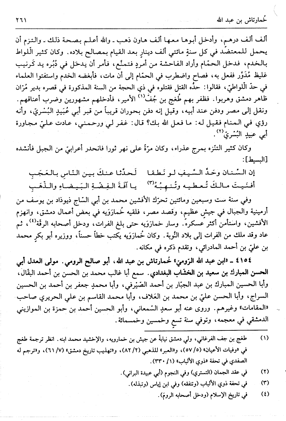 وَفِي سنة سِتّ وَسبعين وَمِائَتَيْنِ تحرّك الأفشين مُحَمَّد بن أبي السّاج ذيوذاد ابْن يُوسُف من أرمينية وَالْجِبَال فِي جيشٍ عظيمٍ وَقصد مصر فَلَقِيَهُ خمارويه فِي بعض أَعمال دمشق وَانْهَزَمَ الأفشين وَاسْتَأْمَنَ أَكثر عسكره وَسَار خمارويه حَتَّى بلغ الْفُرَات وَدخل أَصْحَابه الرقّة ثمَّ عَاد وَقد ملك من الْفُرَات إِلَى بِلَاد النُّوبة وَكَانَ خمارويه يكْتب خطا حسنا ووزيره)