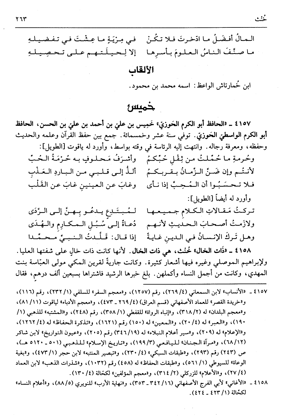 خنث هِيَ ذَات الْخَال لِأَنَّهَا كَانَت ذَات خالٍ على شفتها الْعليا ولإبراهيم الْموصِلِي وَغَيره فِيهَا أشعار كَثِيرَة وَكَانَت جَارِيَة لقرين الْمَكِّيّ مولى العبّاسة بنت الْمهْدي وَكَانَت من أجمل النِّسَاء وأكملهن بلغ خَبَرهَا الرشيد فاشتراها بسبعين ألف درهمٍ فَقَالَ
