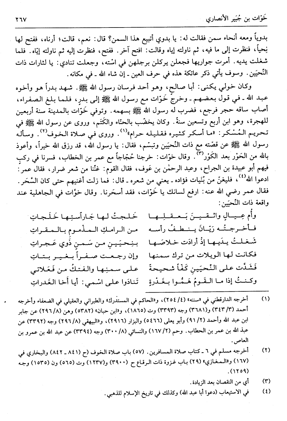 وَتُوفِّي خوّات بِالْمَدِينَةِ سنة أَرْبَعِينَ لِلْهِجْرَةِ وَهُوَ ابْن أربعٍ وَتِسْعين سنة وَكَانَ يخضّب بالحنّاء والكتم وروى عَن رَسُول الله صلى الله عَلَيْهِ وَسلم فِي تَحْرِيم الْمُسكر مَا أسكر كَثِيره فقليله حرَام وروى فِي صَلَاة الْخَوْف وَسَأَلَهُ رَسُول الله صلى الله عَلَيْهِ وَسلم عَن قصّته مَعَ ذَات النِّحيين وتبسّم فَقَالَ يَا رَسُول الله قد رزق الله خيرا وَأَعُوذ بِاللَّه من الْحور بعد الكور وَقَالَ خوّات خرجنَا حجّاجاً مَعَ عمر بن الْخطاب فسرنا فِي ركبٍ فيهم أَبُو عُبَيْدَة بن الْجراح وَعبد الرَّحْمَن بن عَوْف فَقَالَ الْقَوْم غنِّنا من شعر ضرار فَقَالَ عمر ادعوا الله فليغنّ من بنيات فُؤَاده يَعْنِي من شعره قَالَ فَمَا زلت أغنيهم حَتَّى كَانَ السَّحر فَقَالَ عمر رَضِي الله عَنهُ ارْفَعْ لسَانك يَا خوّات فقد أسحرنا وَقَالَ خوَّات فِي الْجَاهِلِيَّة عِنْد وَاقعَة ذَات النِّحيين