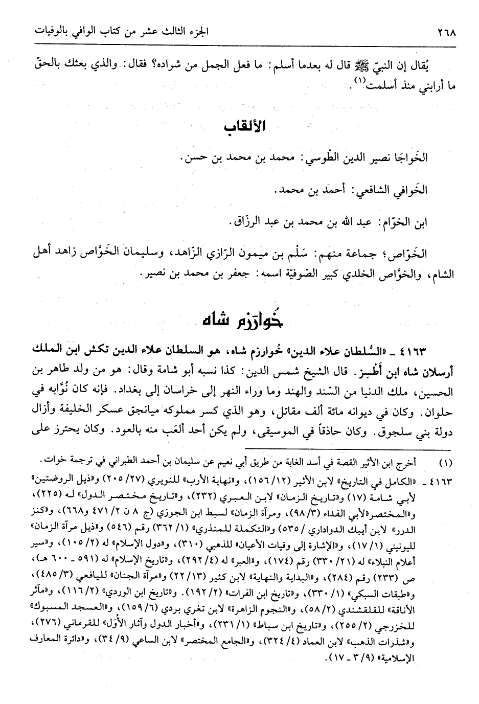خوارزم شاه هُوَ السُّلْطَان عَلَاء الدّين تكش ابْن الْملك أرسلان شاه بن أطسز قَالَ الشَّيْخ شمس الدّين كَذَا نسبه أَبُو شامة وَقَالَ هُوَ من ولد طَاهِر بن الْحُسَيْن ملك الدُّنْيَا من السّند والهند وَمَا وَرَاء النَّهر إِلَى خُرَاسَان إِلَى بَغْدَاد فَإِنَّهُ كَانَ نوَّابه فِي حلوان وَكَانَ فِي ديوانه مائَة ألف مقَاتل وَهُوَ الَّذِي كسر مَمْلُوكه ميانجق عَسْكَر الْخَلِيفَة وأزال دولة بني سلجوق وَكَانَ حاذقاً فِي الموسيقى وَلم يكن أحد أَلعَب مِنْهُ بِالْعودِ وَكَانَ يحْتَرز على