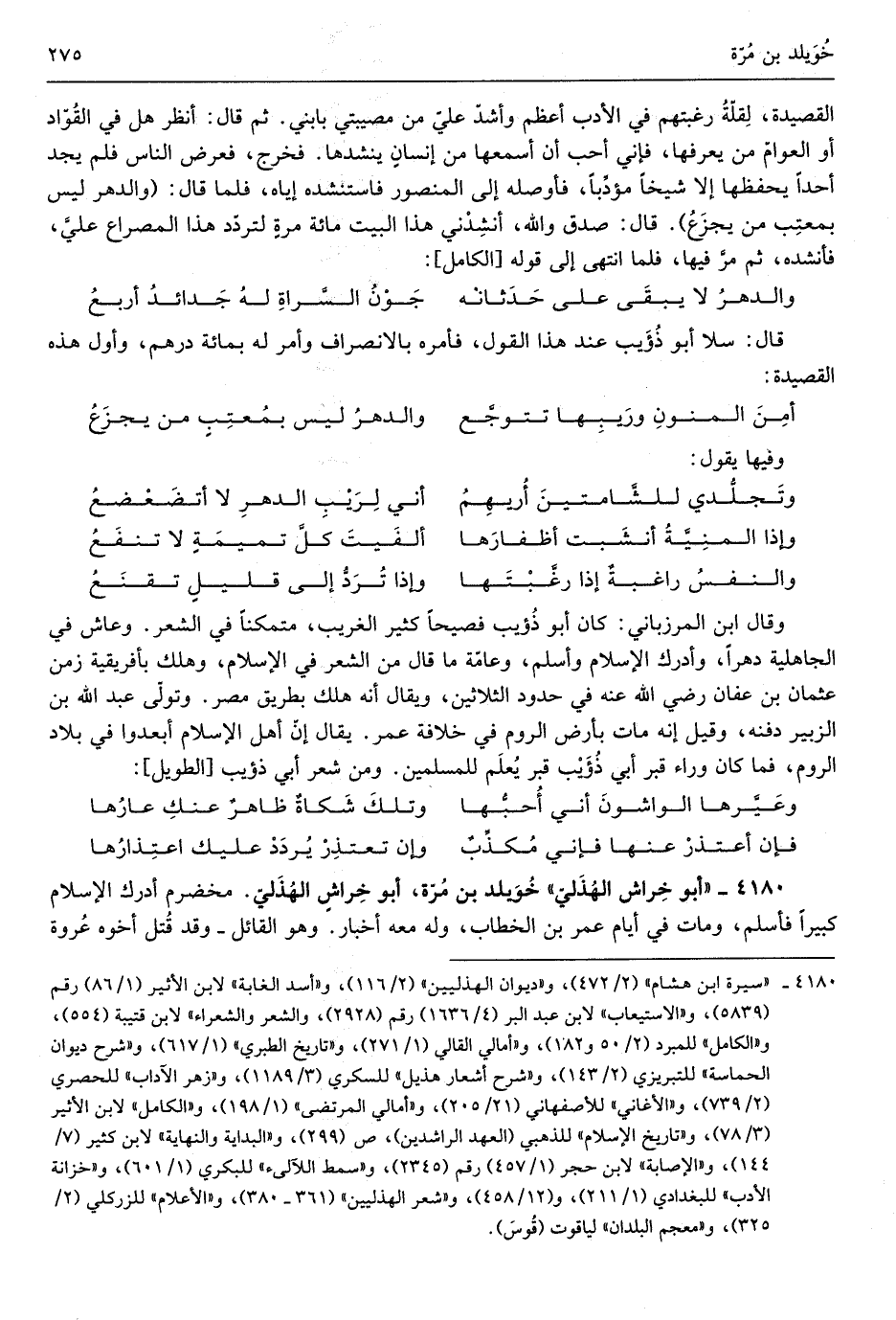 وَقَالَ ابْن المرزباني كَانَ أَبُو ذُؤَيْب فصيحاً كثير الْغَرِيب مُتَمَكنًا فِي الشّعْر وعاش فِي الْجَاهِلِيَّة دهراً ودرك الْإِسْلَام وَأسلم وعامّة مَا قَالَ من الشّعْر فِي الْإِسْلَام وَهلك بأفريقية زمن عُثْمَان بن عَفَّان رَضِي الله عَنهُ فِي حُدُود الثَّلَاثِينَ وَيُقَال أَنه هلك بطرِيق مصر وتولّى عبد الله بن الزبير دَفنه وَقيل أَنه مَاتَ بِأَرْض الرّوم فِي خلَافَة عمر يُقَال أنّ أهل الْإِسْلَام أبعدوا فِي بِلَاد الرّوم فَمَا كَانَ وَرَاء قبر أبي ذُؤَيْب قبر يعلم للْمُسلمين وَمن شعر أبي ذُؤَيْب من الطَّوِيل