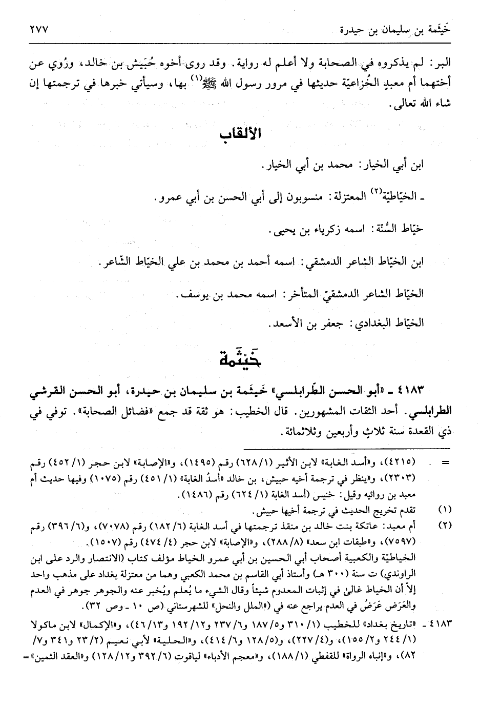 خَيْثَمَة بن سُلَيْمَان بن حيدرة أَبُو الْحسن الْقرشِي الطرابلسي أحد الثِّقَات الْمَشْهُورين قَالَ الْخَطِيب هُوَ ثِقَة قد جمع فَضَائِل الصَّحَابَة توفّي فِي ذِي الْقعدَة سنة ثلاثٍ وَأَرْبَعين وَثَلَاث مائَة