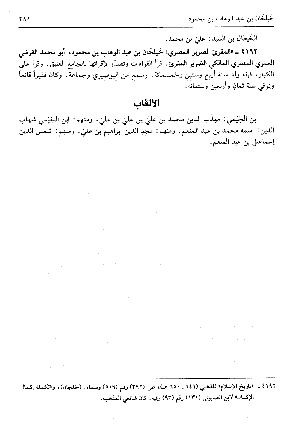 خيلخان بن عبد الْوَهَّاب بن مَحْمُود أَبُو مُحَمَّد الْقرشِي الْعمريّ الْمصْرِيّ الْمَالِكِي الضَّرِير المقرىء قَرَأَ الْقرَاءَات وتصدّر لإقرائها بالجامع الْعَتِيق وَقَرَأَ على الْكِبَار فَإِنَّهُ ولد سنة أَربع وَسِتِّينَ وَخمْس مائَة وَسمع من البوصيري وَجَمَاعَة وَكَانَ فَقِيرا قانعاً وَتُوفِّي سنة ثمانٍ وَأَرْبَعين وست مائَة