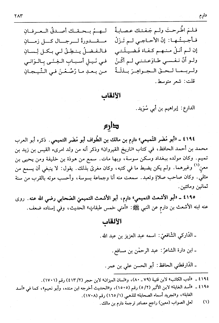 دارم أَبُو الْأَشْعَث التميميّ الصّحابي رَضِي الله عَنهُ روى عَنهُ ابْنه الْأَشْعَث ابْن دارم عَن النَّبِي صلى الله عَلَيْهِ وَسلم أمتِي خمس طبقاتٍ الحَدِيث وَفِي إِسْنَاده ضعف