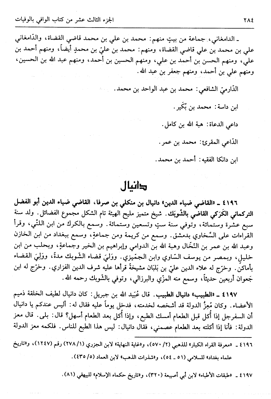 دانيال بن منكلي بن صرفا القَاضِي ضِيَاء الدّين أَبُو الْفضل التركماني الكركي القَاضِي بالشَّوبك شيخ متميز مليح الْهَيْئَة تَامّ الشكل مَجْمُوع الْفَضَائِل ولد سنة سبع عشرَة وست مائَة وَتُوفِّي سنة ستٍ وَتِسْعين وست مائَة وَسمع بالكرك من ابْن اللَّتي وَقَرَأَ الْقرَاءَات على السَّخاوي بِدِمَشْق وَسمع من كَرِيمَة وَمن جماعةٍ وَسبع بِبَغْدَاد من ابْن الخازن وَعبد الله بن عمر بن النخّال وَهبة الله بن الدّوامي وَإِبْرَاهِيم بن الْخَيْر وجماعةٍ وبحلب من ابْن خليلٍ وبمصر من يُوسُف السّاوي وَابْن الجمّيزي وَولي قَضَاء الشّوبك مُدَّة وَولي الْقَضَاء بأماكن