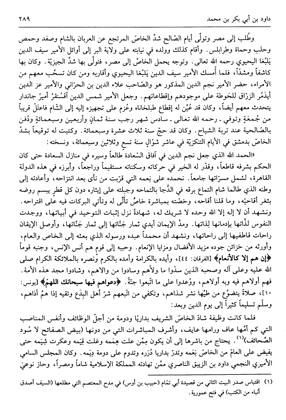 قطرٍ يبسم روضه بثغر أقاحيّه وَمَا قُلْنَا أقاحه وخصّته بِمُبَاشَرَة خاصٍّ تأتَّى لَهُ وَتَأْتِي البركات فِيهِ على اقتراحه ونشهد أَن لَا إِلَه إِلَّا الله وَحده لَا شريك لَهُ شَهَادَة نزل إِثْبَات التَّوْحِيد فِي أبياتها وَوجدت النُّفُوس لذَّاتها بإدمانها لذاتها ومدَّ الْإِيمَان أَيدي جنَّاتها إِلَى ثمار جنَّاتها وأوصل الإيقان راحات قاطفيها إِلَى راحاتها ونشهد أَن مُحَمَّدًا عَبده وَرَسُوله الَّذِي بَعثه إِلَى الْخَاص وَالْعَام وأورثه من خَزَائِن جوده مزِيد الأفضال ومزايا الإنعام وحببه إِلَى قومٍ هم أنس الْإِنْس وجنبه قوما إِن هم إلاَّ كالأنعام وأيده بالكرامة وأمده بِالْكَرمِ وَنَصره بِالْمَلَائِكَةِ الْكِرَام صلى الله عَلَيْهِ وعَلى آله وَصَحبه الَّذين سدّوا مَا ولاّهم وسادوا من والاهم وشادوا مجد هَذِه الْأمة فهم أولاهم فِيهِ وَبِه أولاهم ووعدوا على مَا اتبّعوا جنّةً دَعوَاهُم فِيهَا سُبْحَانَكَ اللهمّ صَلَاة يتضوَّع من طيِّها نشر شذاهم وتكفي من اتّبعهم شرّ أهل الْبدع وتقيه إِذا همَّ أذاهم وسلّم تَسْلِيمًا كثيرا إِلَى يَوْم الدّين وَبعد فَلَمَّا كَانَت وَظِيفَة شادّ الخاصّ الشريف بداريّا ودومة من أجلّ الْوَظَائِف وأنفس المناصب الَّتِي كم أمَّها عاف ورامها عايف وأشرف المباشرات الَّتِي من دونهَا بيض الصفائح لَا سود الصَّحائف يحْتَاج من بَاشَرَهَا إِلَى أَن يكون ممَّن علت هممه وغلت قيمه وعكرت شيمه حَتَّى يفِيض على العامّ من الخاصّ نعمه وتدرّ بداريا درره وتدوم على دومة ديمه وَكَانَ الْمجْلس السَّامِي الأميري النجمي دَاوُد بن الزيبق النصاري ممَّن تهادته المملكة الإسلامية شاماً ومصراً وَحَازَ نَوْعي
