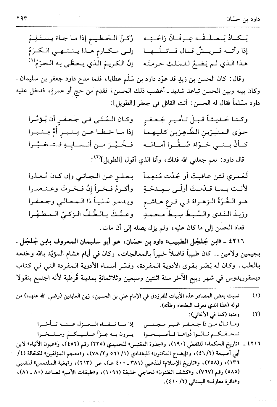 دَاوُد بن حسّان هُوَ أَبُو سُلَيْمَان الْمَعْرُوف بِابْن جلجل بجيمين ولامين كَانَ طَبِيبا فَاضلا خَبِيرا بالمعالجات وَكَانَ فِي أَيَّام هِشَام المؤيّد بِاللَّه وخدمه بالطب وَكَانَ لَهُ بصر بقوى الْأَدْوِيَة المفردة وفسّر أَسمَاء الْأَدْوِيَة المفردة الَّتِي فِي كتاب ديسقوريدوس فِي شهر ربيع الآخر سنة اثْنَتَيْنِ وَسبعين وَثَلَاثَة مائةٍ بِمَدِينَة قطربة لِأَنَّهُ اجْتمع بنقولا