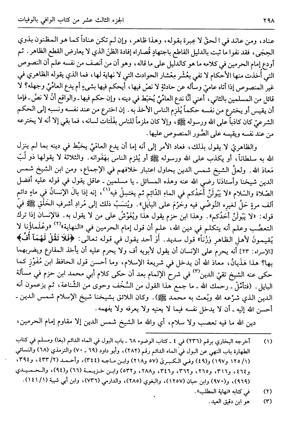 والظاهريّ لَا يَقُول بذلك فَعَاد الْأَمر إِلَى أَنه إِمَّا أَن يدع العامّيَّ يخبِّط فِي دينه لما لم ينزل الله بِهِ سُلْطَانا أَو يكذب على الله وَرَسُوله صلى الله عَلَيْهِ وَسلم أَو يلْزم النَّاس بهفواته وَالثَّلَاثَة لَا يَقُولهَا ذُو لبّ معَاذ الله ولعلَّ الشَّيْخ شمس الدّين يحاول اعْتِبَار خلافهم فِي الْإِجْمَاع وَمن ابْن الشَّيْخ شمس الدّين شَيخنَا وأستاذنا رَضِي الله عَنهُ وَهَذِه الْمسَائِل يَا مُسلمين عَاقل يَقُول فِي قَوْله عَلَيْهِ أفضل الصّلاة والسّلام لَا يبولنَّ أحدكُم فِي المَاء الدّائم ثمَّ يغْتَسل فِيهِ إِنَّه إِذا بَال الْإِنْسَان فِي ماءٍ دائمٍ ألف مرةٍ حلَّ لغيره التَّوضِّي فِيهِ وَحرم على البايل وينسب ذَلِك إِلَى مُرَاد أشرف الْخلق صلى الله عَلَيْهِ وَسلم فِي قَوْله لَا يبولنَّ أحدكُم وَهَذَا ابْن حزم يَقُول هَذَا ويغوِّش على من لَا يَقُول بِهِ فالإنسان إِذا ترك التعصُّب وَعلم أَنه يتلكم فِي دين الله علم أَن قَول إِمَام الْحَرَمَيْنِ فِي النِّهَايَة وعلماؤنا لَا يُقِيمُونَ لأهل الظَّاهِر وزنا قَول سديد أَو أحد يَقُول فِي قَوْله تَعَالَى وَلَا تقل لَهما أفٍّ أَنه يحرم على الْإِنْسَان أَن يَقُول لِأَبَوَيْهِ أُفٍّ وَلَا يحرم عَلَيْهِ أَن يَأْخُذ المقارع ويضربهما بهَا هَذَا هذيانٌ معَاذ الله أَن يدْخل فِي شَرِيعَة الْإِسْلَام وَمَا أحسن قَول الْحَافِظ ابْن مفوِّزٍ كَمَا حكى عَنهُ الشَّيْخ تقيّ الدّين فِي شرح الْإِلْمَام بعد أَن حكى كَلَام أبي مُحَمَّد)