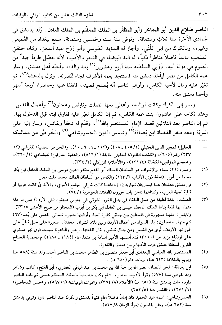 النَّاصِر صَلَاح الدّين أَبُو المفاخر وَأَبُو المظفَّر ابْن الْملك المعظّم ابْن الْملك الْعَادِل ولد بِدِمَشْق فِي جُمَادَى الْآخِرَة سنة ثلاثٍ وست مائَة وَتُوفِّي سنة سِتّ وَخمسين وست مائَة سمع بِبَغْدَاد من الْقطيعِي وَغَيره وبالكرم من ابْن اللَّتِّي وَأَجَازَ لَهُ الْمُؤَيد الطوسي وَأَبُو روح عبد الْمعز وَكَانَ حنفيّ الْمَذْهَب عَالما فَاضلا مناظراً ذكياً لَهُ الْيَد الْبَيْضَاء فِي الشّعْر وَالْأَدب لِأَنَّهُ حصّل طرفا جيدا من الْعُلُوم فِي دولة أَبِيه وَولي السلطنة سنة أَربع وَعشْرين بعد وَالِده وأحبّه أهل دمشق وَسَار عَمه الْكَامِل من مصر ليَأْخُذ دمشق مِنْهُ فاستنجد بِعَمِّهِ الْأَشْرَف فجَاء لنصرته وَنزل بالدهشة ثمَّ تغيِّر عَلَيْهِ وَمَال لِأَخِيهِ الْكَامِل وأوهم النَّاصِر أَنه يصلح قَضيته فاتفقا عَلَيْهِ وحاصراه أَرْبَعَة أشرعٍ وأخذا دمشق مِنْهُ